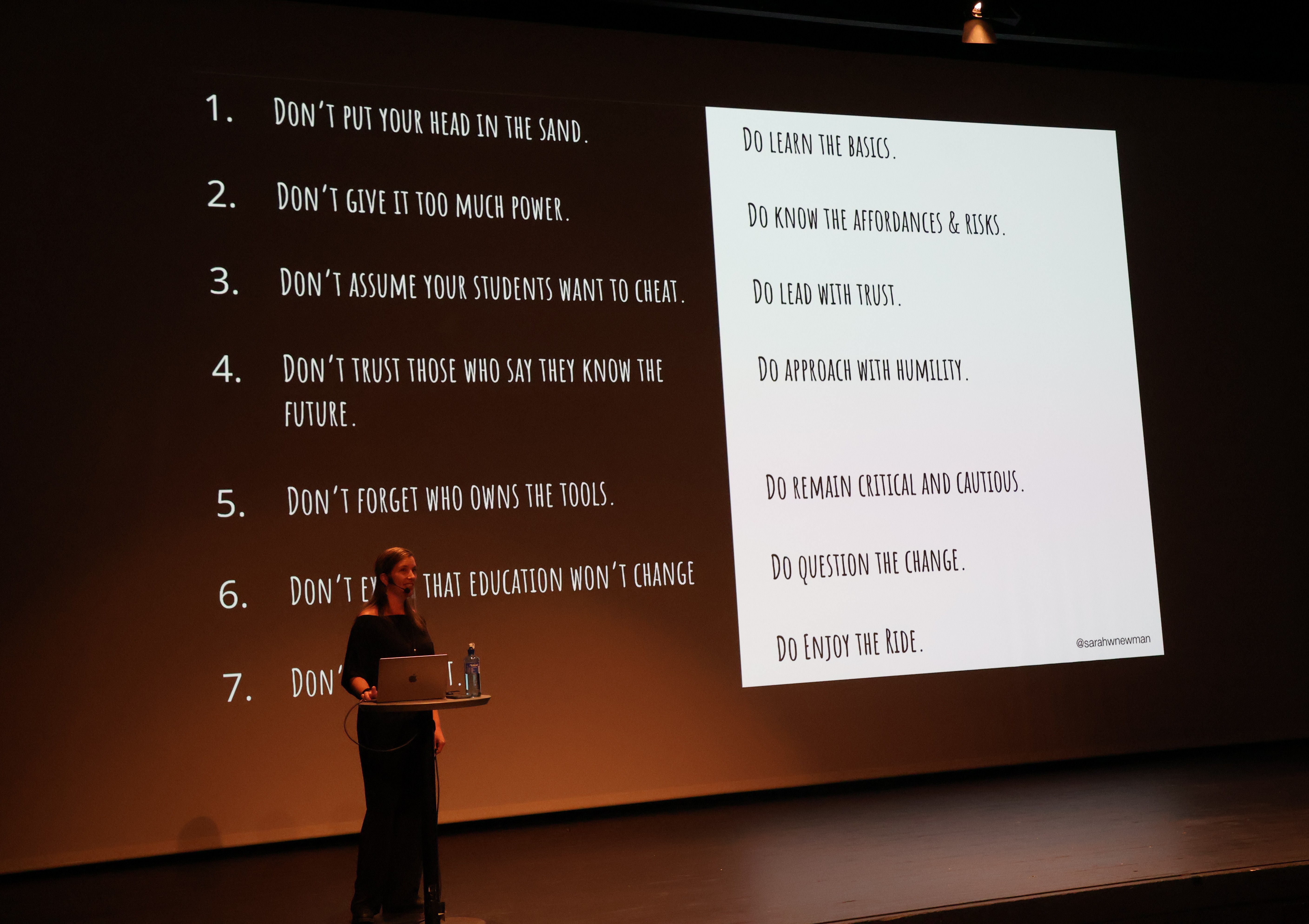 Tittelen på foredraget Embraciing AI Challendes & Opportunities in Education gjekk i kjernen på mange av utfordringane og spørsmåla innan KI i utdanningsektoren. Perspektiva ho trakk fram var relevant for både studentar og forelesarar, og med eit optimistisk grunnlag. På ein engasjerande måte der enkle illustrasjonar underbygde forskinga, drog Newman publikum gjennom eit 90 minutts innhaldsrikt foredrag.