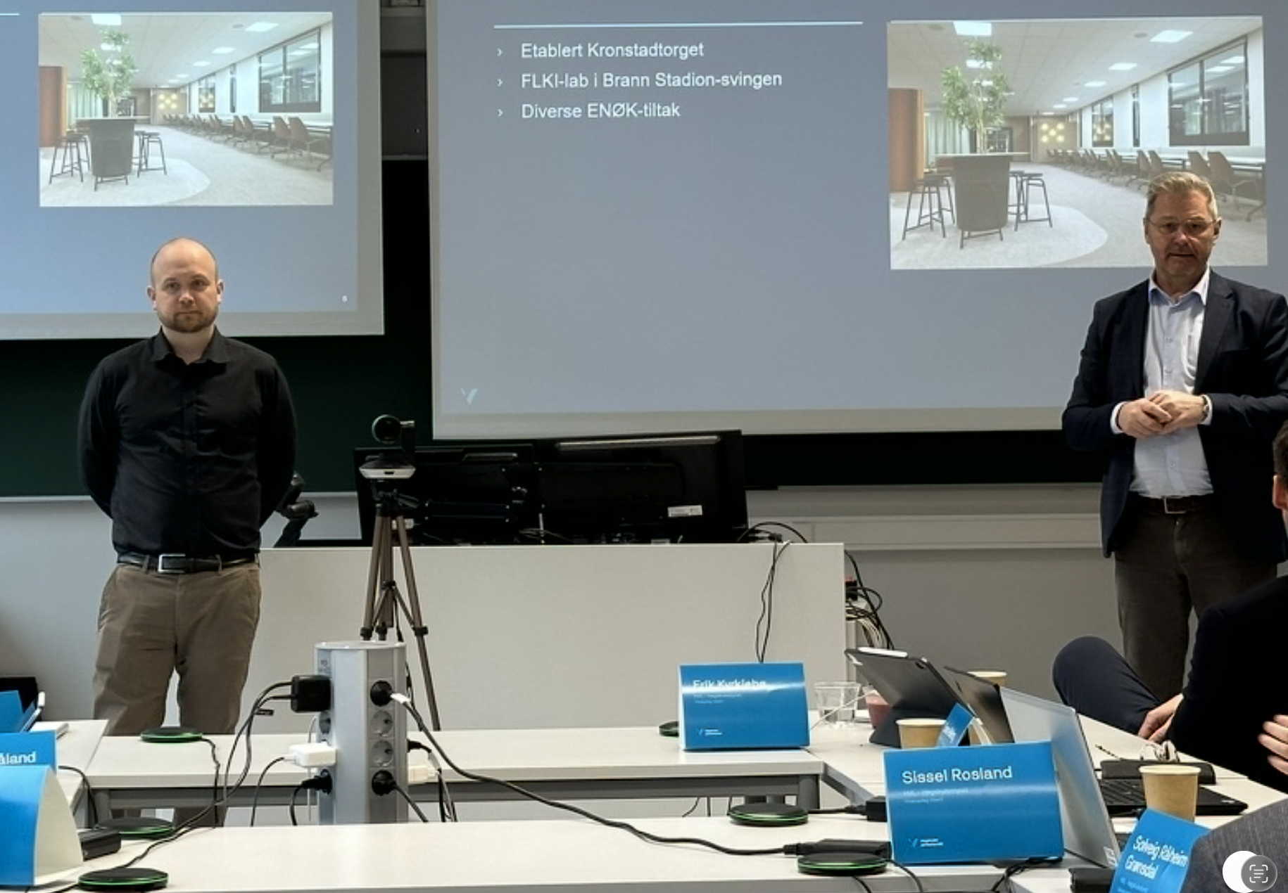 Styret fekk ei grundig oppdatering om pågåande og føreståande arealprosjekt ved alle fem campus av økonomi- og arealdirektør Helge Skugstad (th) og prorektor for regional utvikling og nyskaping, Øyvind M. Berge. For Bergen sonderer ein no moglegheitene for eit nybygg på den såkalla nordtomten på campus Kronstad der O-bygget i dag ligg, like ved bybanestoppet.