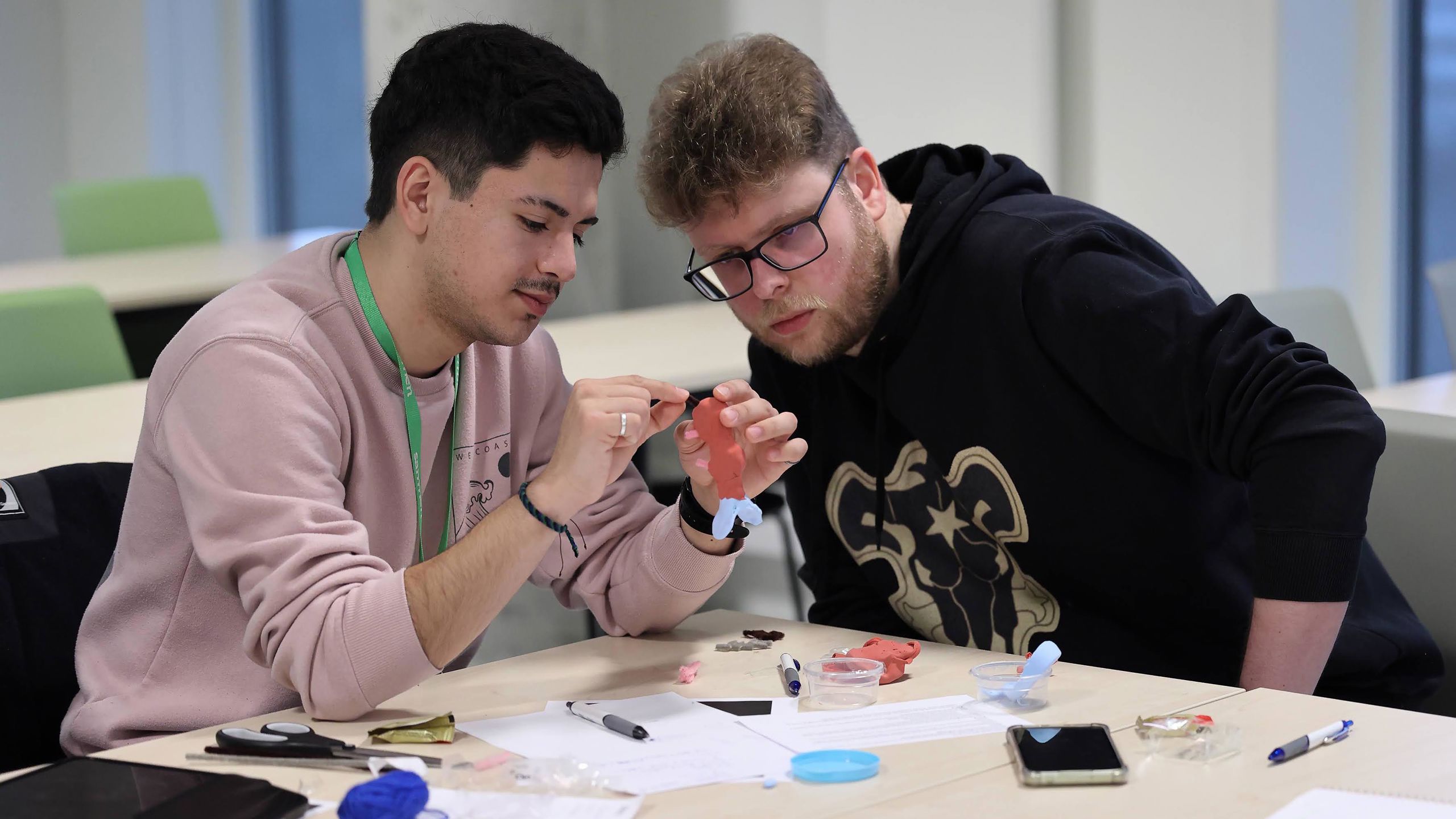 Gruppa som skal løyse oppgåvene er på utveksling frå Chile, Austerrike og Spania. Dei har brukt morgontimane til å lage figuren.