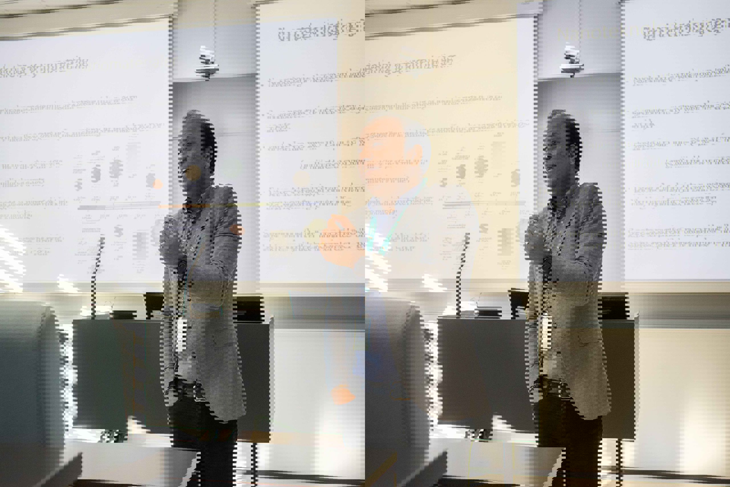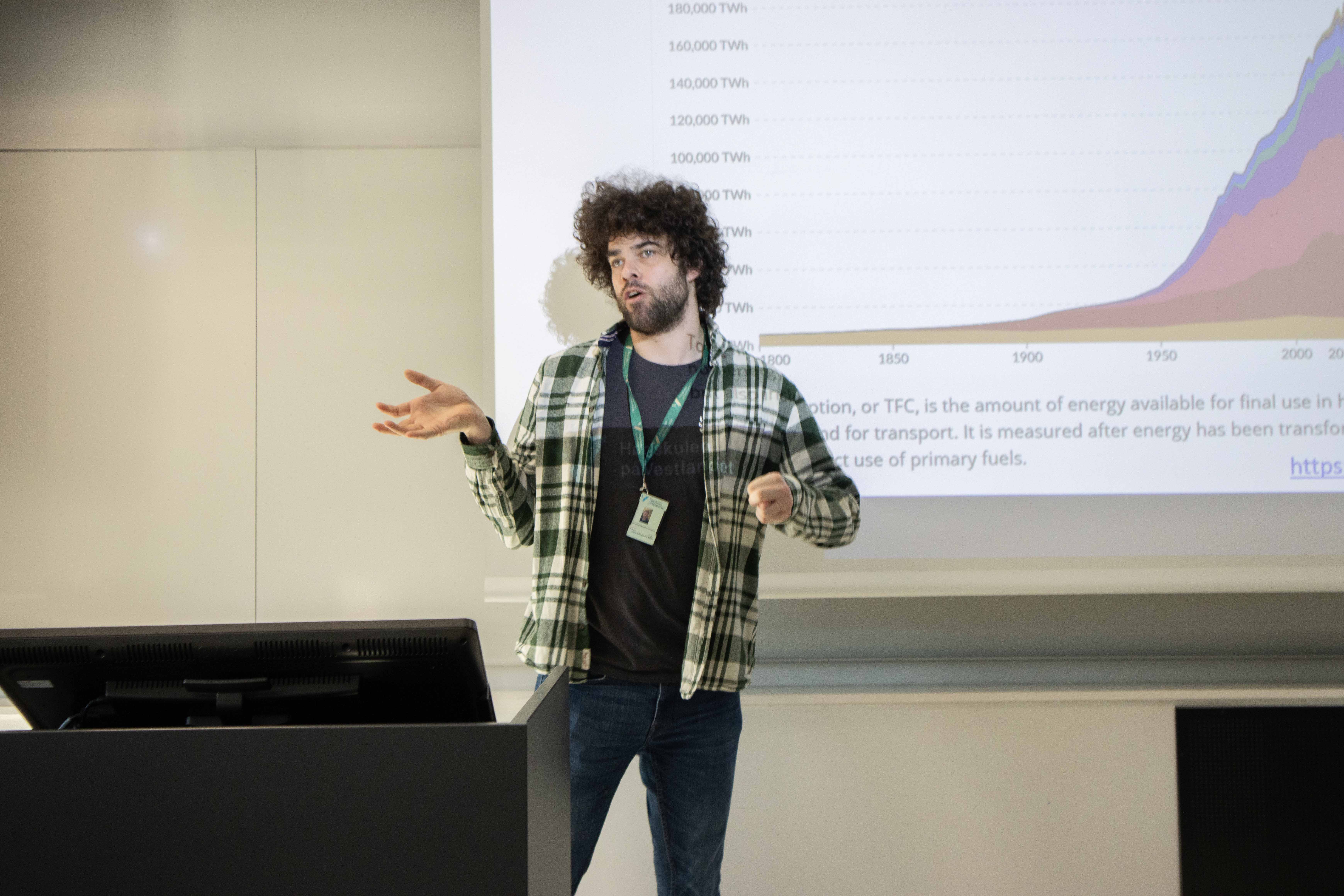 Etter å ha fått mykje ny kunnskap om nanoteknologi, entrar førsteamanuensis Jonathan Økland Torstensen scenen. Han fortel om moglegheiter og utfordringar ved hydrogenenergi, og han nyttar sjansen til å oppfordra dei engasjerte førsteklassingane til å søka seg til HVL om to års tid.