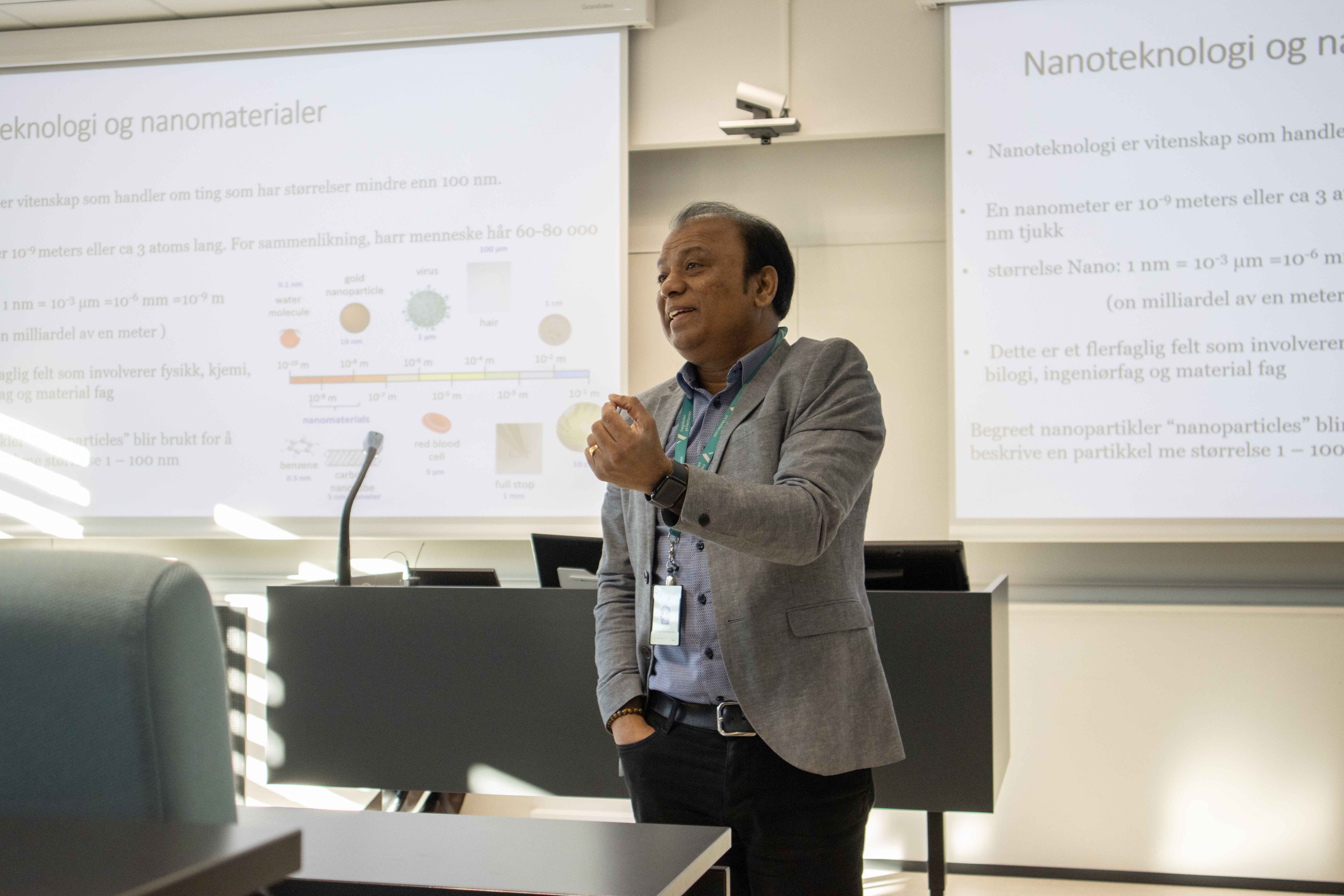 Professor Dhayalan Velauthapillai er i sitt ess. Elevar frå realfagsklassen på Kongshavn vgs. i Oslo har fare heile vegen til Bergen, blant anna for å høyre han snakke om nanoteknologi. Han har publikum i si hole hand.