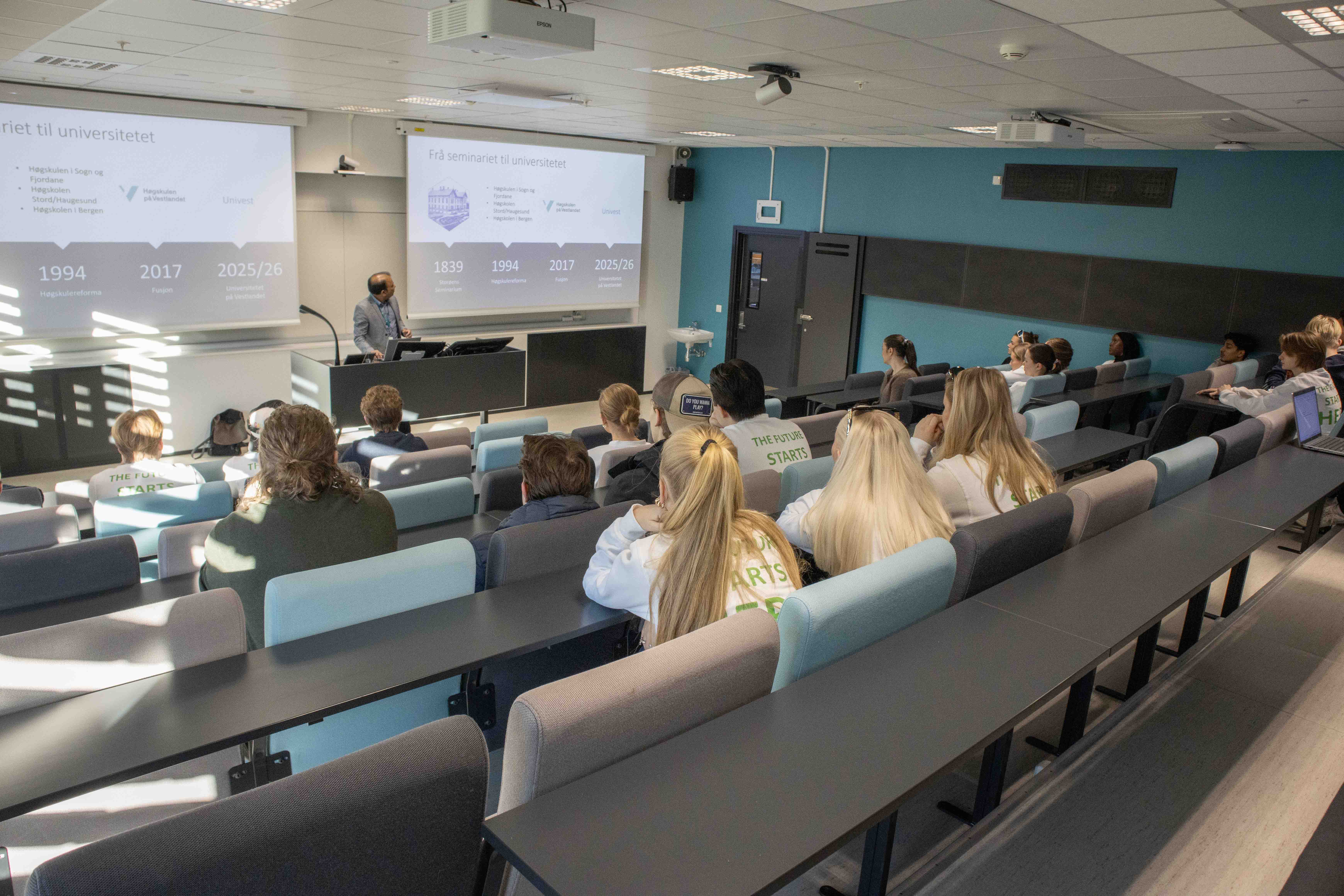 Elevane får seg altså ein skikkeleg smakebit på studentlivet denne dagen. Dei får oppleve førelesingar i auditoriet, og dei får ei omvisning på campus.