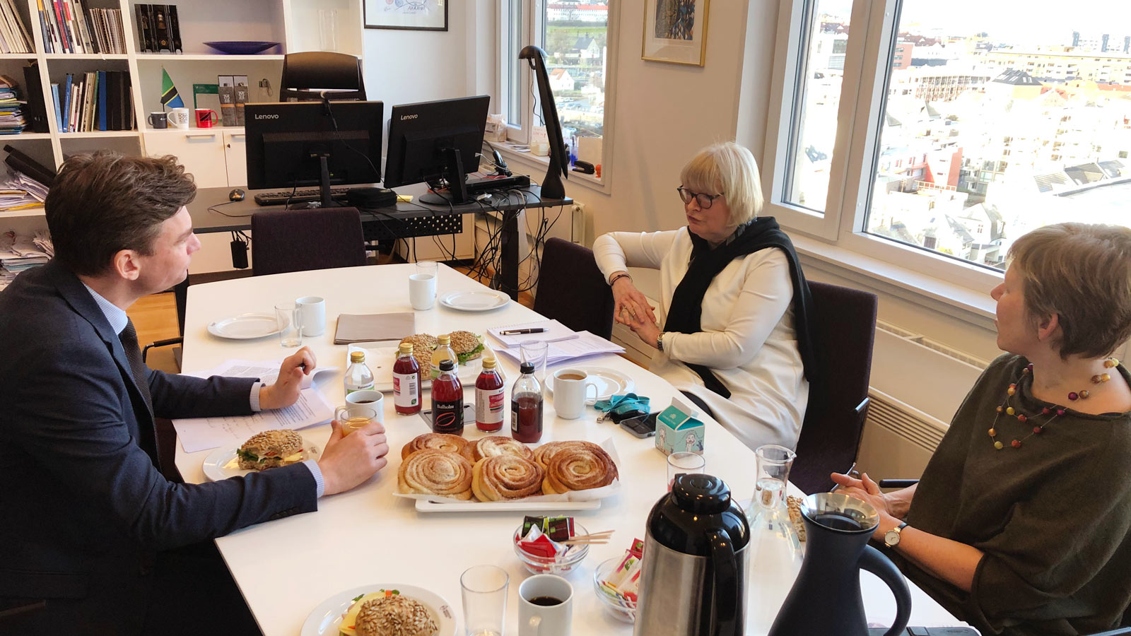 Teodor Solberg Andersen frå Tønsberg og førstelektor Tone Stangeland orienterte Henrik Asheim om prosjektet som HVL leiar. No til helga skal studentane kursast før dei skal rundt på vidaregåande skular langs Vestlandet. Kurset som HVL har utvikla skal og køyrast for studentar ved Universitetet i Tromsø og Høgskolen i Innlandet.