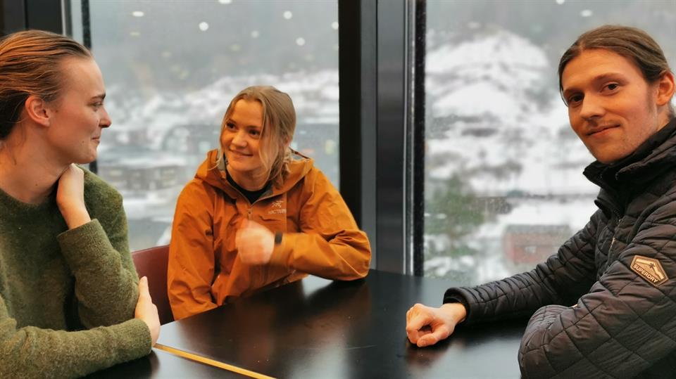 I kantina på campus Sogndal er dei tre studentar ved Geologi og geofare einige i at tett og god kontakt med undervisarar er viktig.