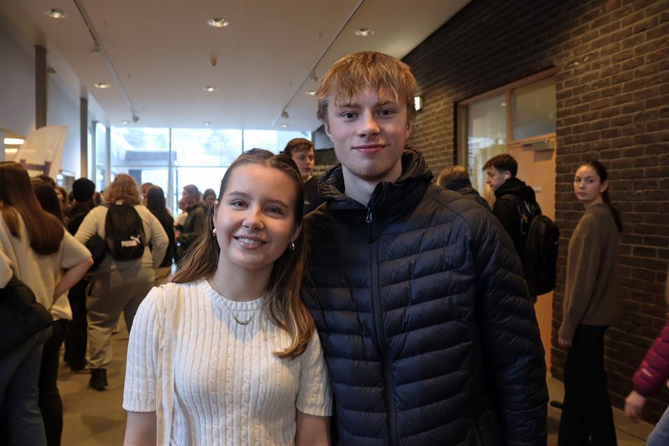 Elevane Patrycja og Anders frå Dale vidaregåande skule var to av dei mange som tok turen. Dei syntes økonomi og realfag virka spennande, og peika på fleire andre faktorar som avgjerande for studievalet.