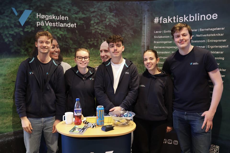 Studentambassadørane Axel, Ingeborg, Øyvind, Andrea og Birk stod på stand og representerte HVL under studieorienteringsdagen.