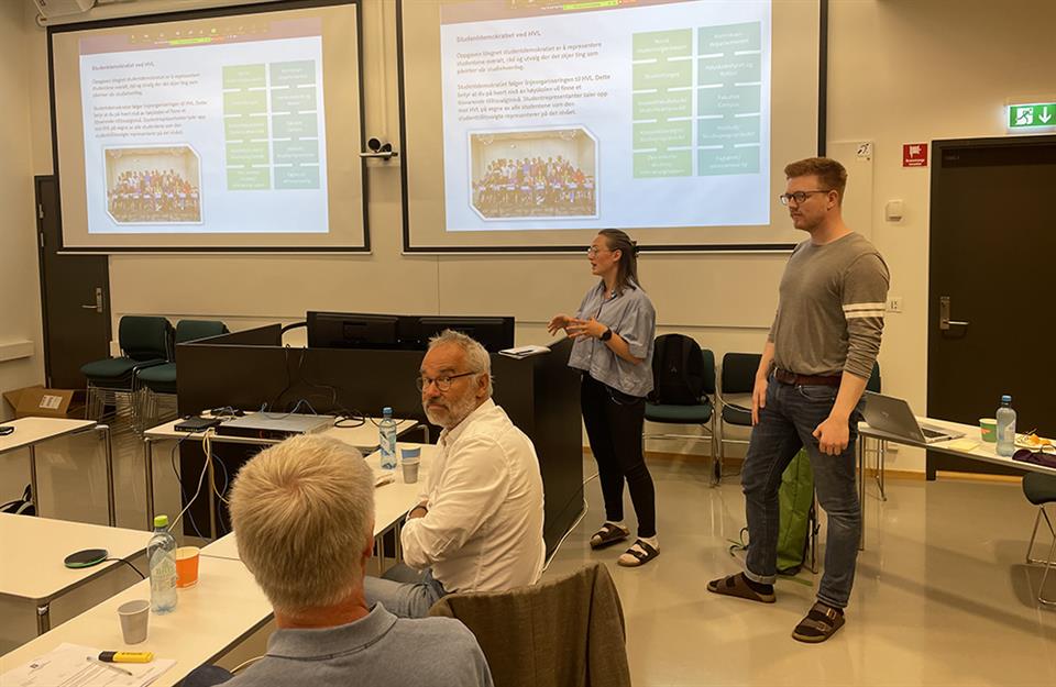 Høgskulestyret møter årleg Studenttinget på Vestlandet til dialog. Her informerer leiar Jelle Sebastian Bruin og berekraft- og rekrutteringsansvarleg, Ruth Emilie Skjærvik Nygård, om korleis Studenttinget er organisert og kva saker som opptek studentane. God studiestart, studentengasjement, levekår og økonomi var tema som vart diskutert.