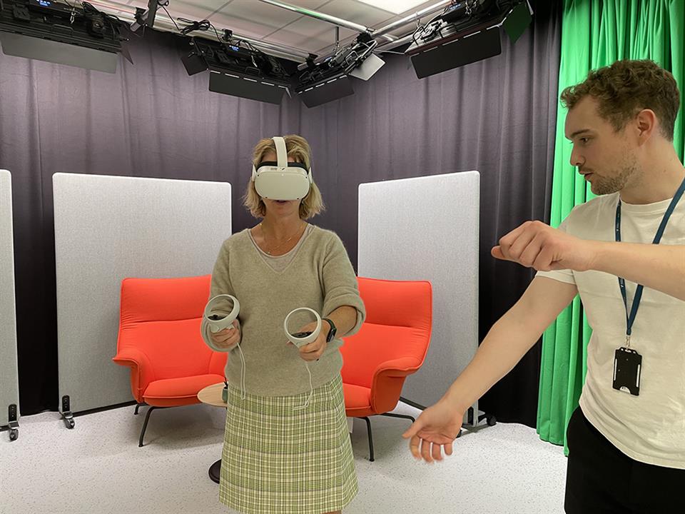 Styremedlem Hege Økland prøver VR-briller og får kyndig hjelp frå rådgjevar Torkjell Einarson Venjum i Læringslaben.