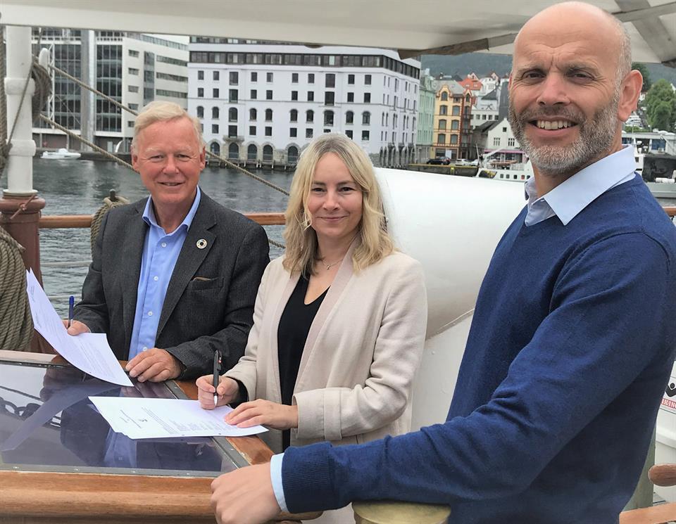 Signering: Næringspolitisk sjef Atle Kvamme i Bergen Næringsråd (t.v), prorektor for forskning ved HVL, Gro Anita Fonnes Flaten og direktør Haakon Vatle i Stiftelsen Seilskipet Statsraad Lehmkuhl signerer samarbeidsavtale.