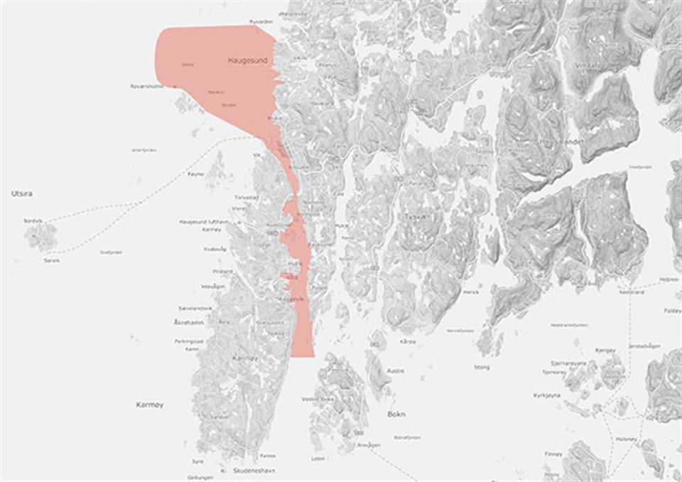 Testsenteret vil dekke deler av sjøområdet utenfor Karmøy og Haugesund, nærmere bestemt Karmsundet, Smedasundet og Sletta. Foto: Kartverket