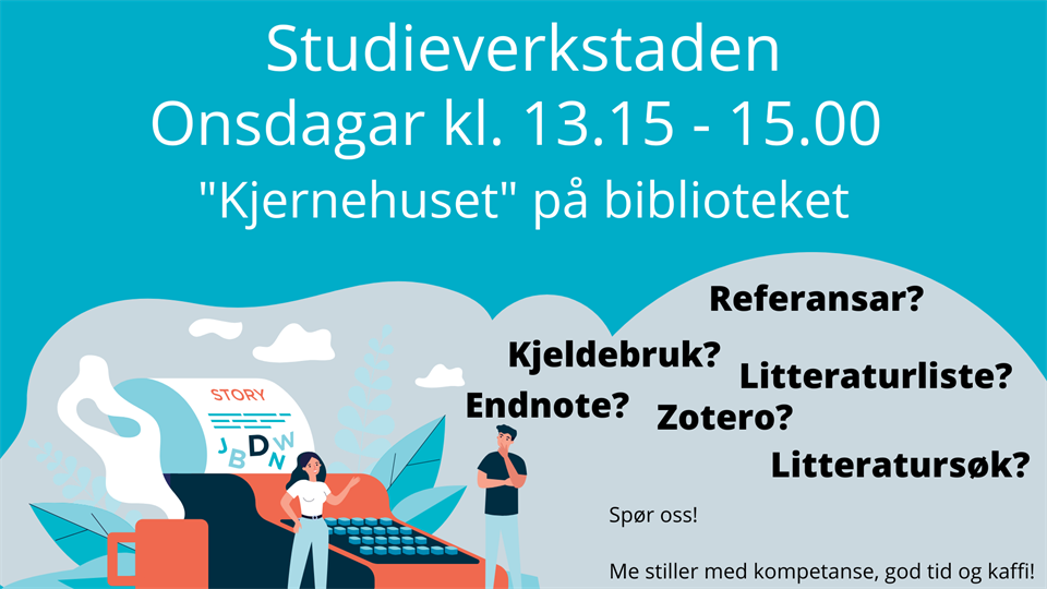 Studieverkstaden er eit tilbod til alle studentar på alle nivå. Har du spørsmål om kjeldebruk, referansar eller litteraturliste? Treng du hjelp med litteratursøk, eller lurer du på noko heilt anna? Spør oss!