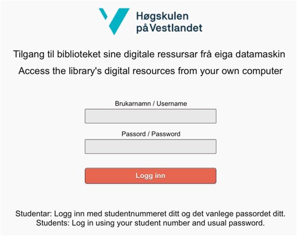 Studentar og tilsette ved HVL får tilgang med sitt HVL-brukarnamn (utan "@hvl.no") og passord. Etter at du har logga på, blir du sendt vidare til ressursen/artikkelen, og får samstundes tilgang til alle andre ressursar biblioteket abonnerer på.