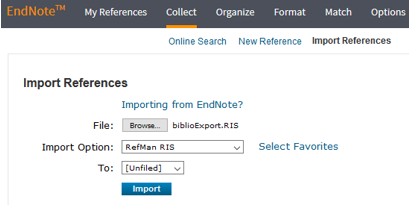 Filene har endinger som: .enw, .ris, .nbib etc. - Gå til EndNote online og klikk på fanen Collect → Import References