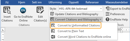 Dette gjøres ved å klikke på Convert Citations and Bibliography → Convert to Unformatted Citations (under Tools i Mac-versjonen). Som resultat kommer EndNote-kodene fram og litteraturlisten forsvinner. Klikk Update Citations and Bibliography for å få referansene tilbake til formatert form.