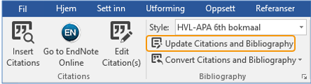 Når du redigerer referanser i EndNote-biblioteket, må de oppdateres i Word-dokumentet. Dette gjøres automatisk innimellom, men kan gjøres manuelt ved å klikke på Update Citations and Bibliography. Denne funksjonen finner du rett under stilmenyen i Windows, og gjemt under Bibliography i EndNote-verktøylinjen for Mac.