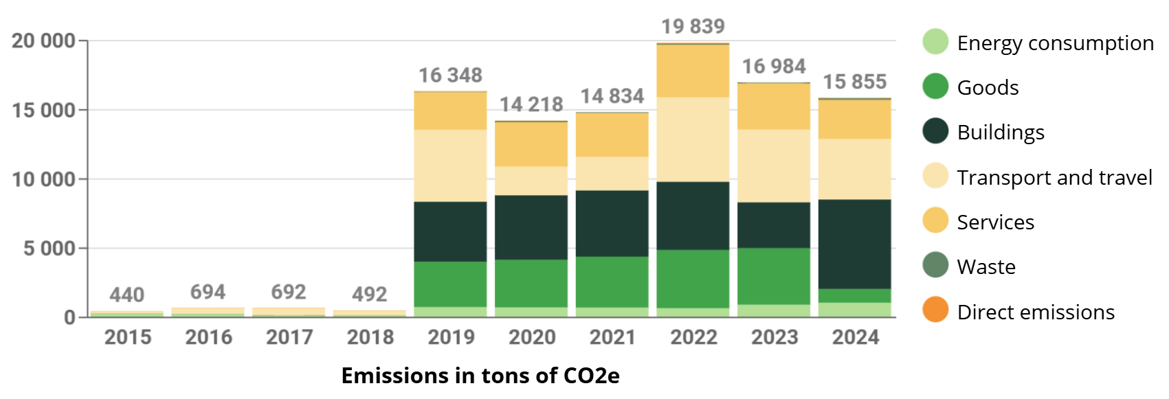 *The category of buildings has seen an increase between 2023 and 2024, as the model in 2024 was expanded to also include emissions from capital (depreciation) in the emission factors. Since capital is a particularly important contribution in the building category, this leads to a significant increase here.