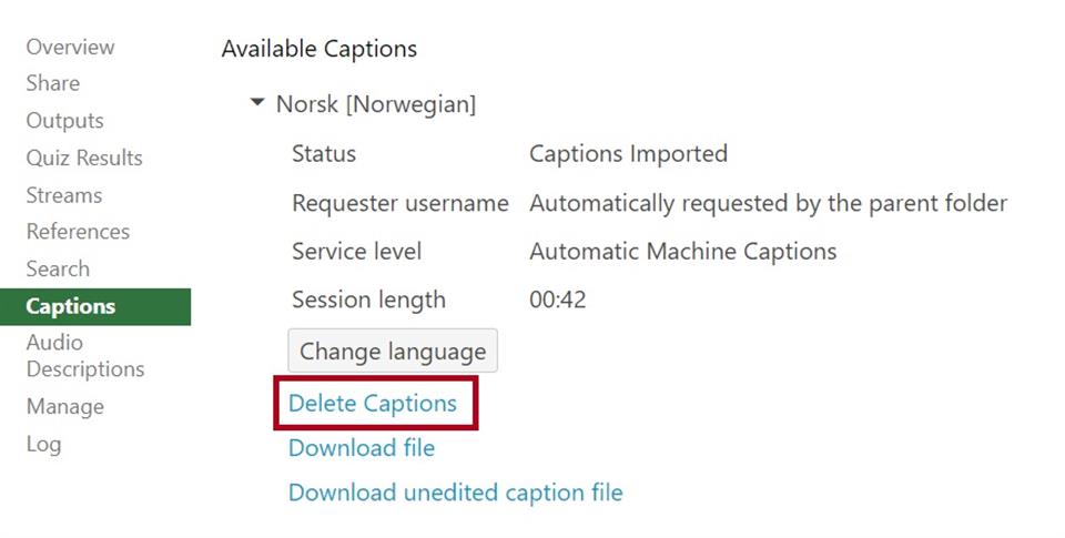 - Go to "Captions". Open "Available captions" and press "Delete captions" to remove auto-generated captions.