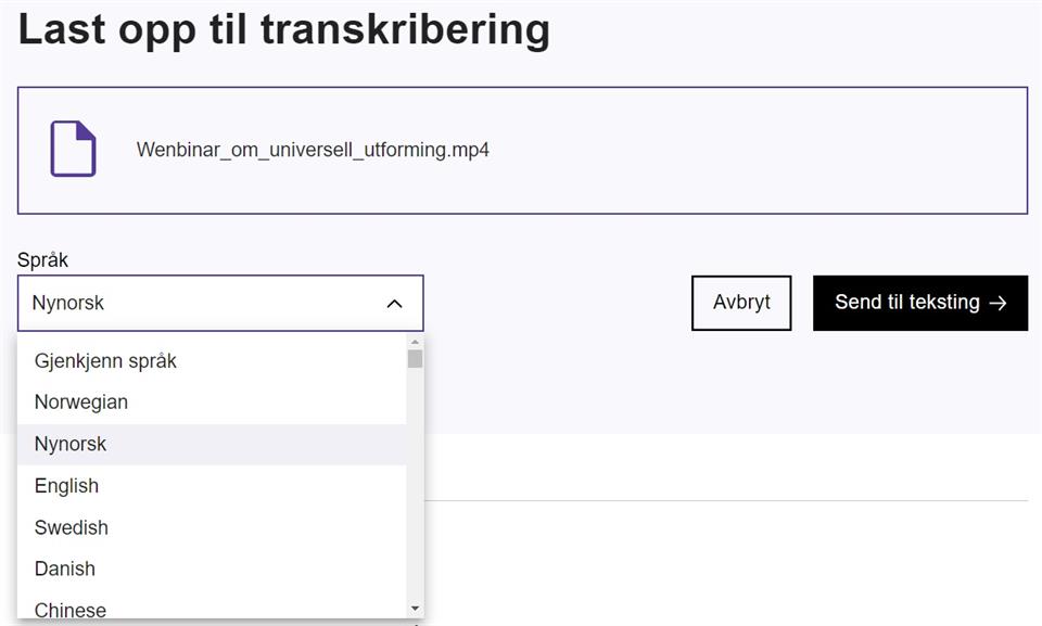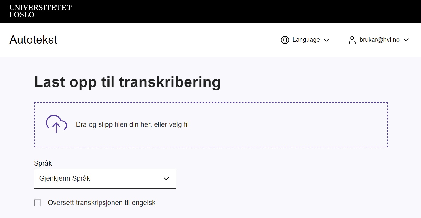 Autotekst is an auto-transcription service from UiO. Data is stored locally on UiO's servers. The solution can transcribe formats such as MP3, FLAC, WAV, M4A, MP4, MOV, WEBM. The maximum size per file is 4GB. In terms of time, the transcription takes about 20% of the length of the video to process. So if you have a 15-minute video, it takes around three minutes to get a finished text file. You can leave the page while the file is being processed.