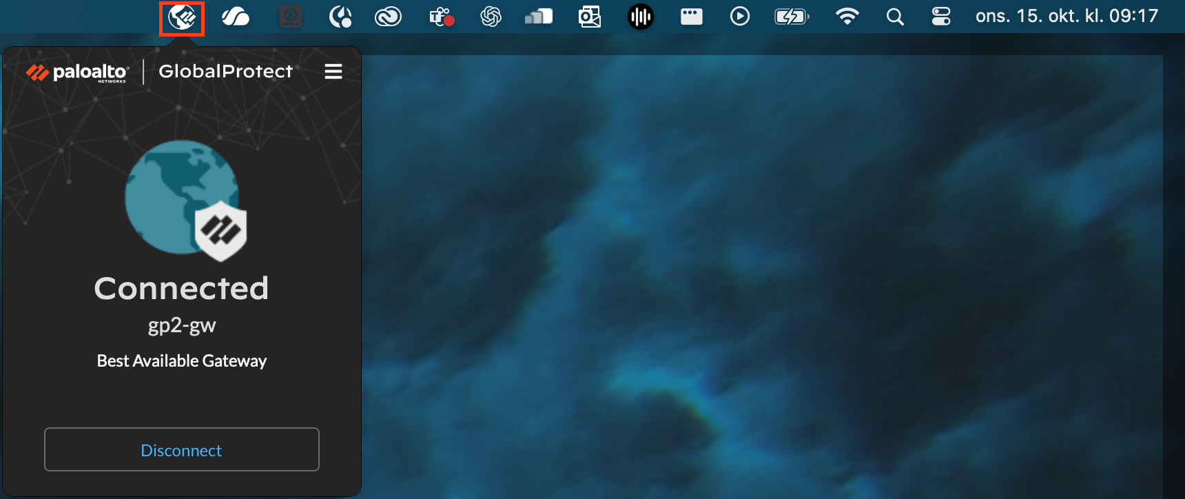 The VPN client connected to gp2.hvl.no will not start automatically, but you can connect whenever you need it. You may stay logged in for extended periods if you want extra protection against internet threats. To connect, find the GlobalProtect icon on your computer and click Connect. Then, if prompted, log in with your username (short name with @hvl.no) and password, and use MFA (multi-factor authentication) when requested. (See the section on manual installation.)