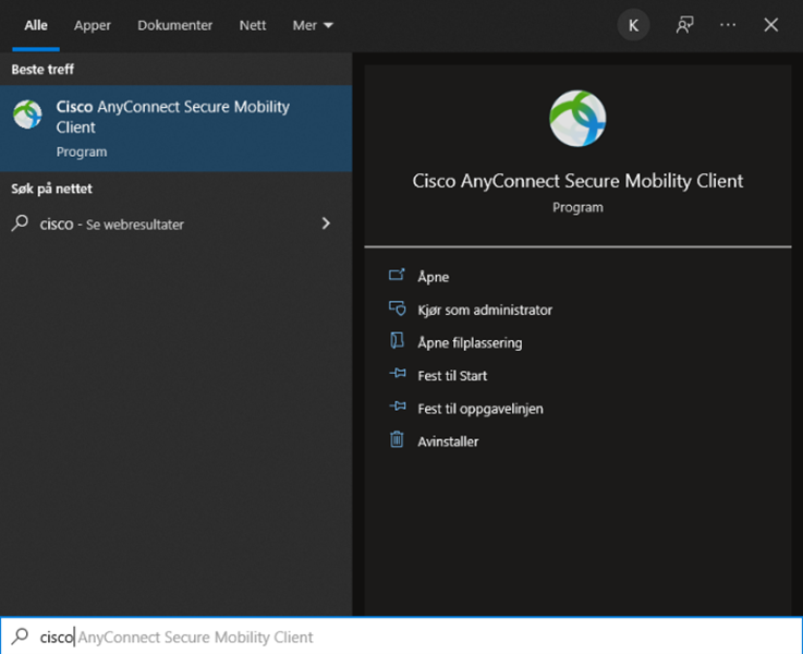 - Click on the Start/Windows button at the bottom left corner of the screen and select "All Programs," then "Cisco," and "Cisco AnyConnect Secure Mobility Client." You can also search for "Cisco" in the Start menu, and the program will appear.