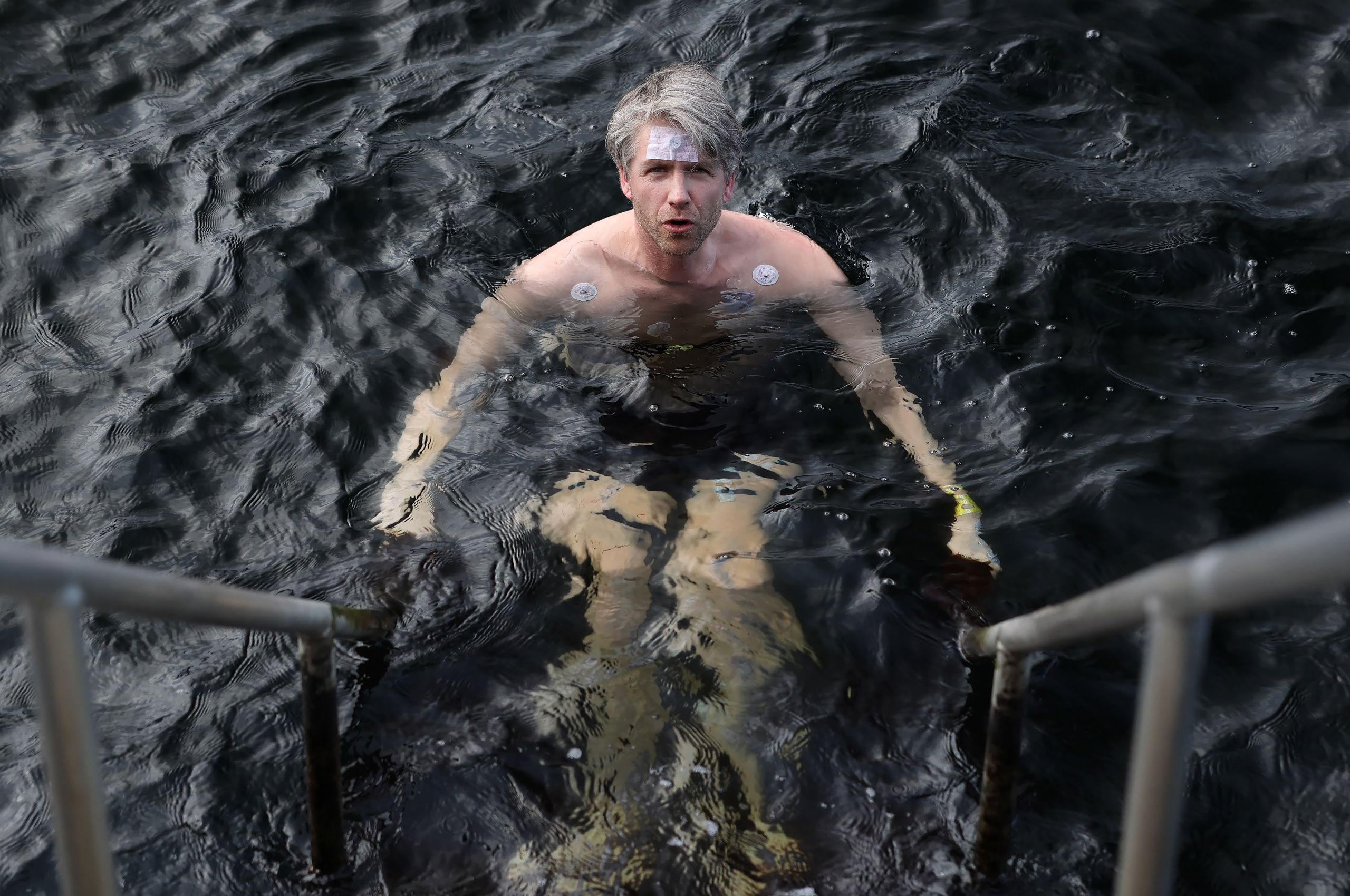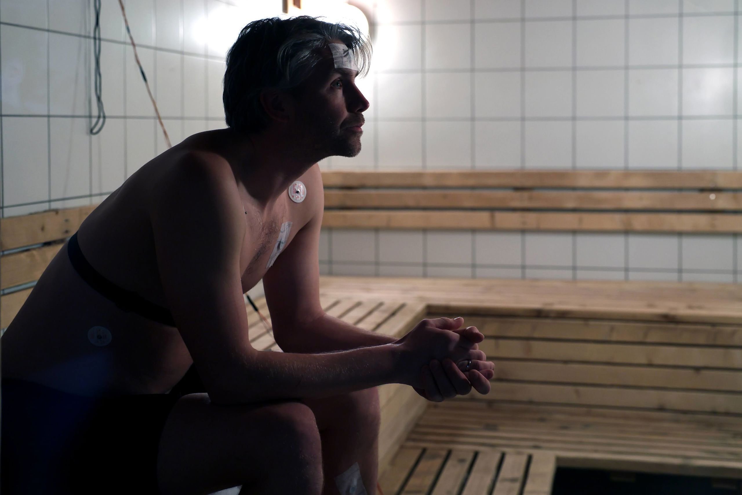 With electrodes attached from head to toe, he spent one minute in the cold water. Now, ten minutes in the sauna await before he must return into the water once more.