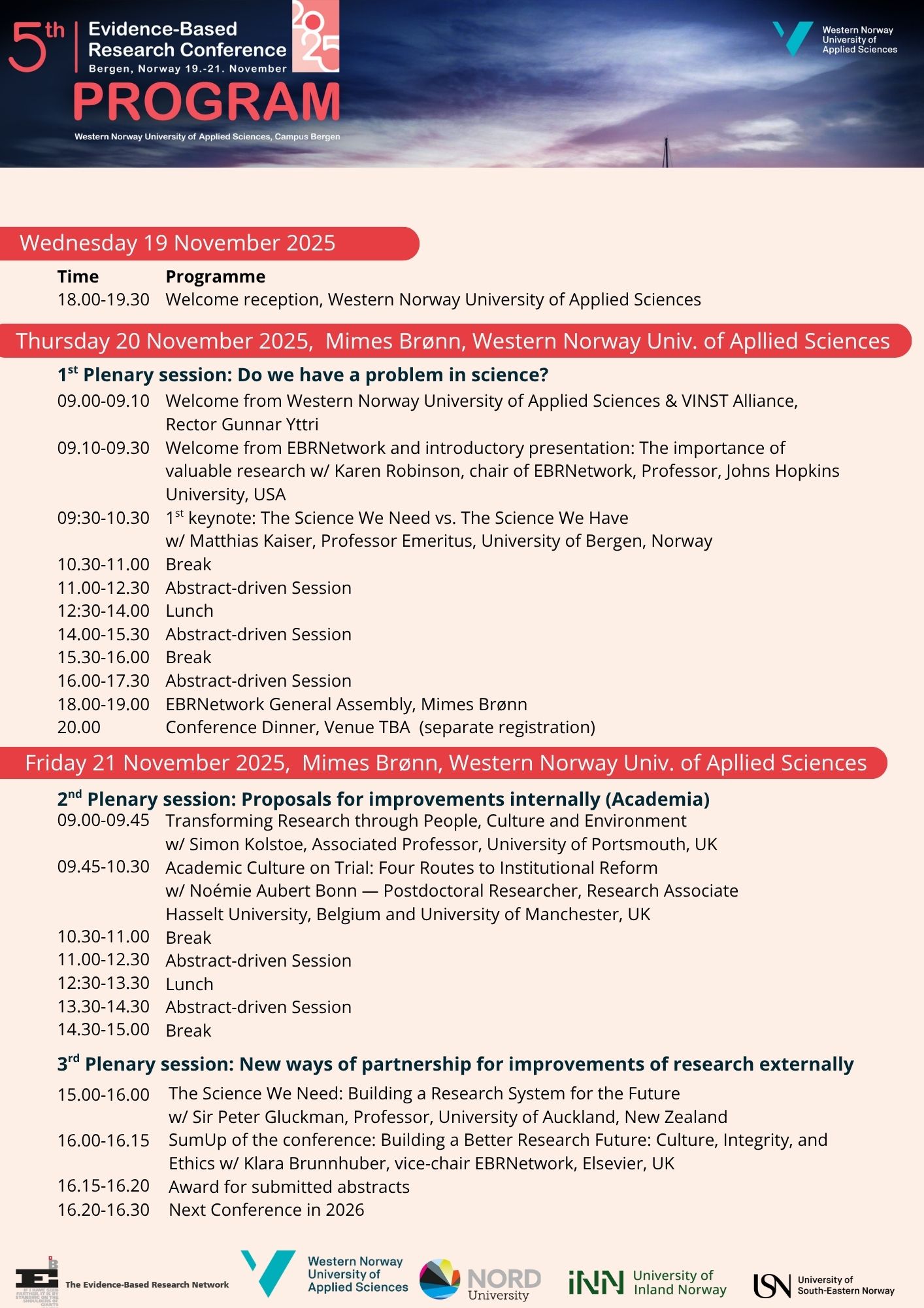 On behalf of the organizing partners we are delighted to invite researchers and leaders from academia, industry, NGOs, and other sectors to join the 5th EBR Conference to share insights, foster collaboration, and explore strategies for enhancing research environments that supports valuable research. Valuable research is research that is rigorously designed to ensure validity, addresses both scientific and societal relevance, and provides a high return on investment relative to its costs, including resources and participant risks.