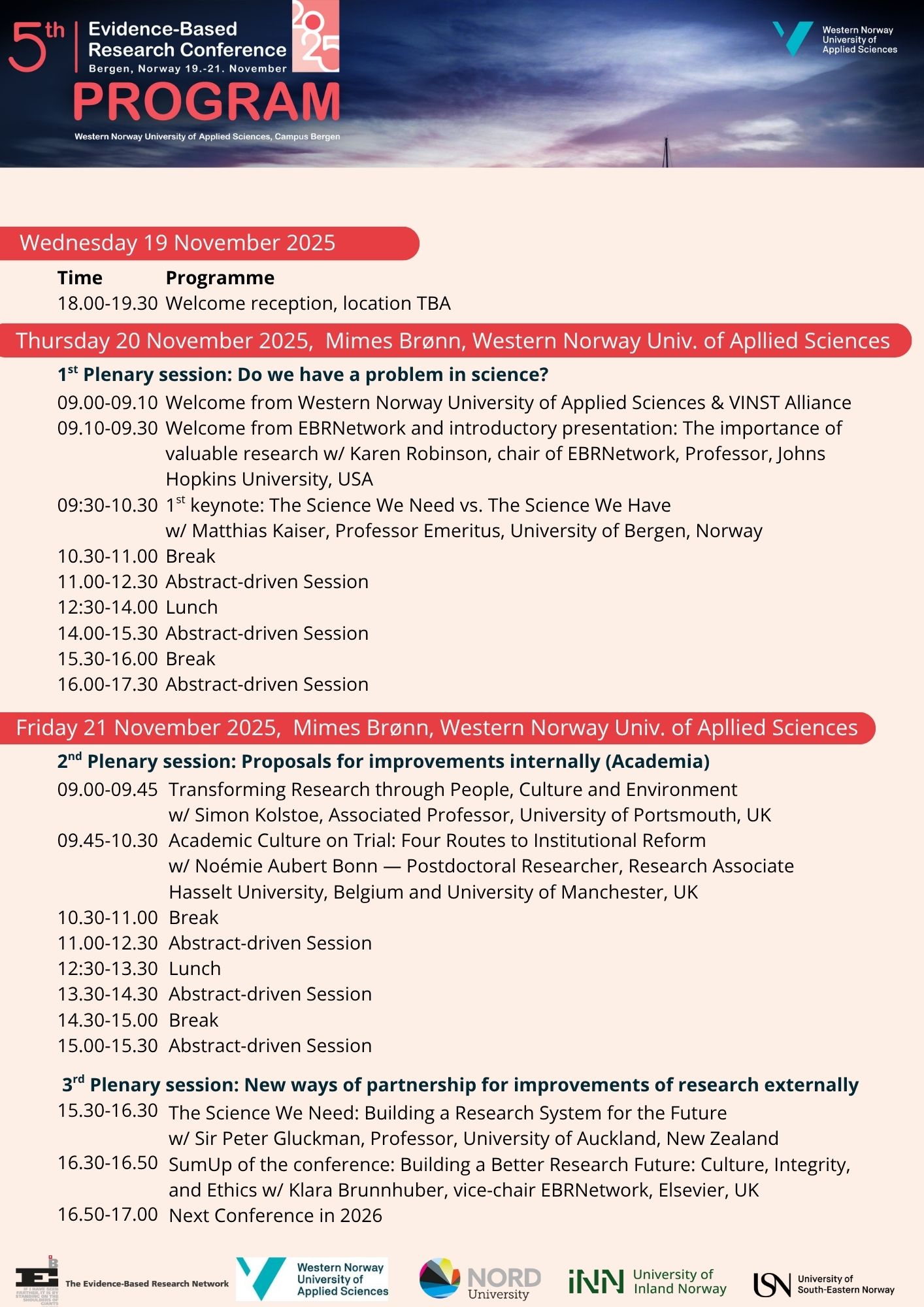 On behalf of the organizing partners we are delighted to invite researchers and leaders from academia, industry, NGOs, and other sectors to join the 5th EBR Conference to share insights, foster collaboration, and explore strategies for enhancing research environments that supports valuable research. Valuable research is research that is rigorously designed to ensure validity, addresses both scientific and societal relevance, and provides a high return on investment relative to its costs, including resources and participant risks.
