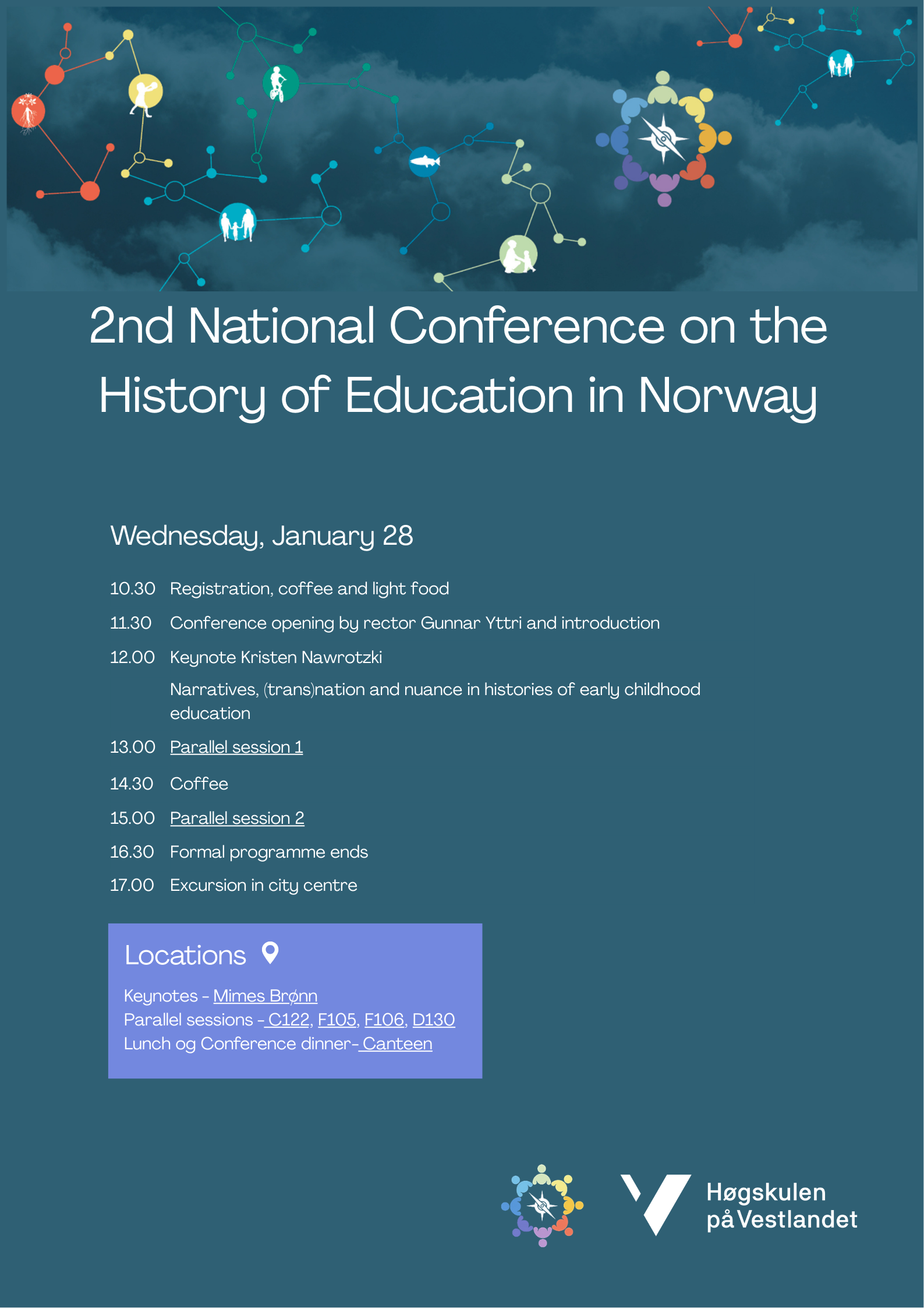 We are pleased to welcome you to the 2nd National Conference on the History of Education in Norway. This time, the academic community around KINDknow, the Kindergarten Knowledge Centre for Systemic Research on Diversity and Sustainable Futures at the Western Norway University of Applied Sciences – will host the conference, which will take place at the Kronstad campus in Bergen, January 28–30, 2026.