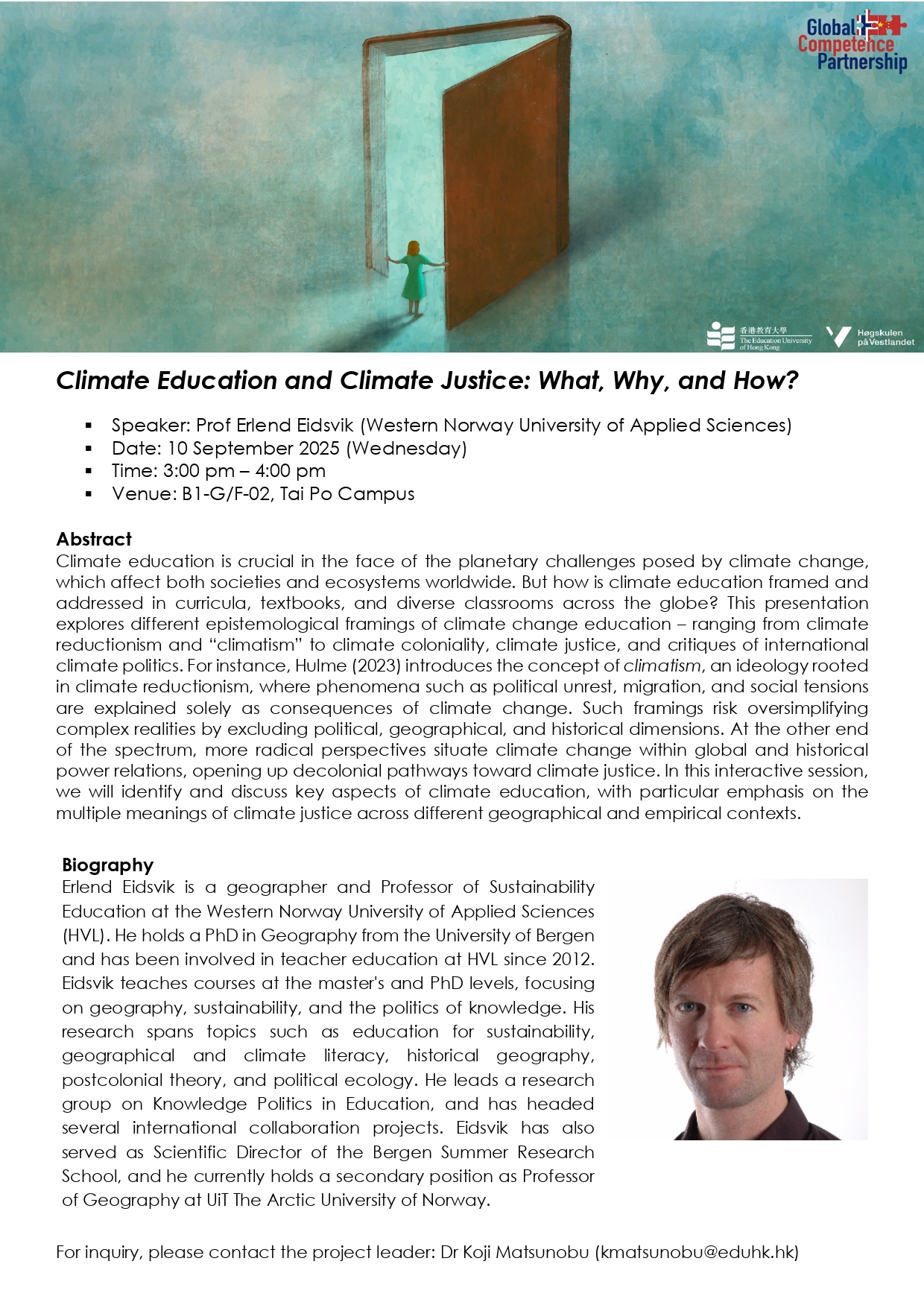 In September 2025, a small delegation from Bergen visited Hong Kong. Among the highlights of this visit were HVL geographer Erlend Eidsvik’s presentation “Climate Education and Climate Justice: What, Why and How?” which attracted nearly 80 participants at Education University of Hong Kong, where there is deep interest in the issue of climate change.