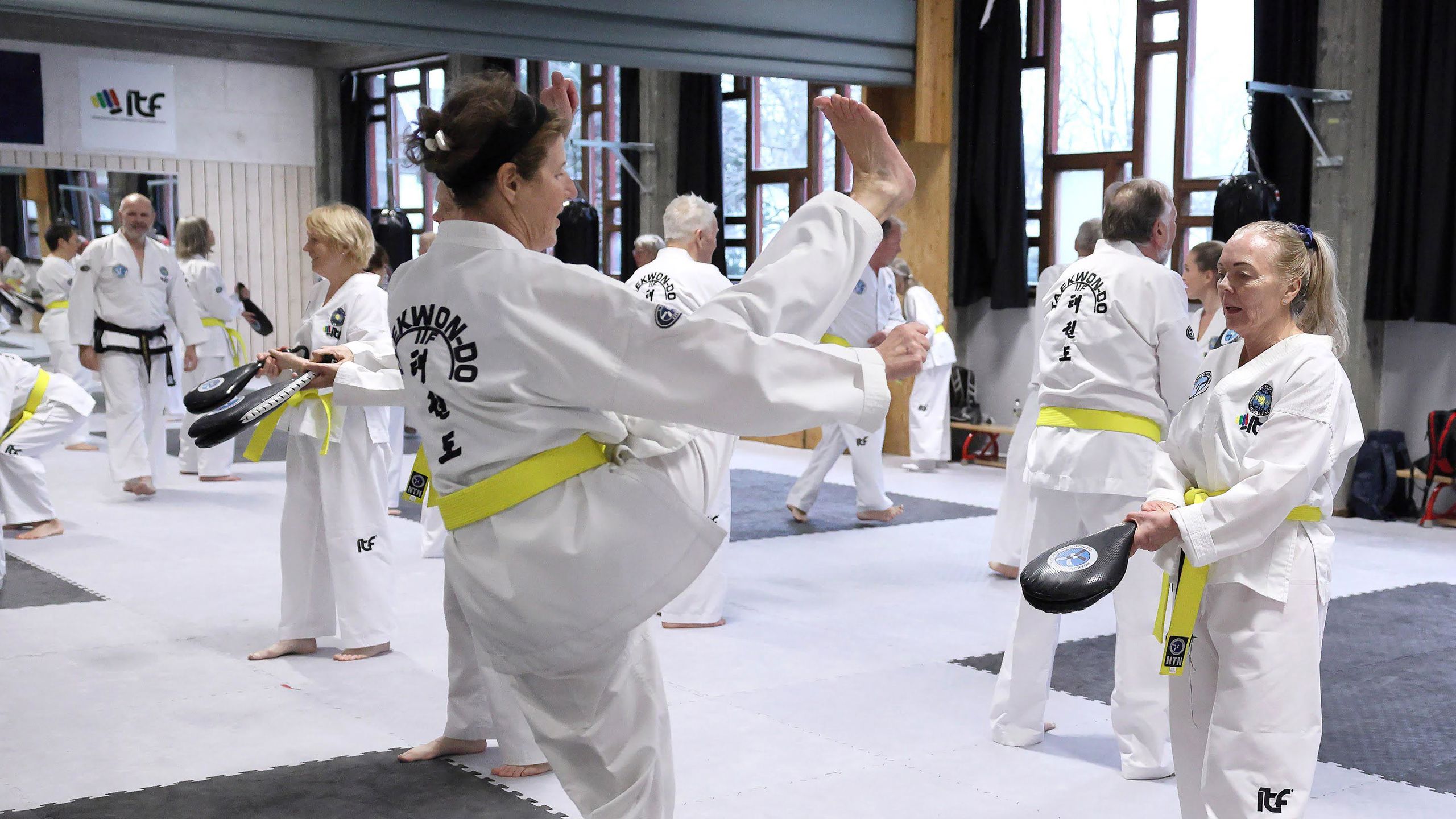 I taekwondo-salen i Haukelandshallen er det djup konsentrasjon, høge spark og raske handbevegelsar. Men smilet og latteren sit og laust.