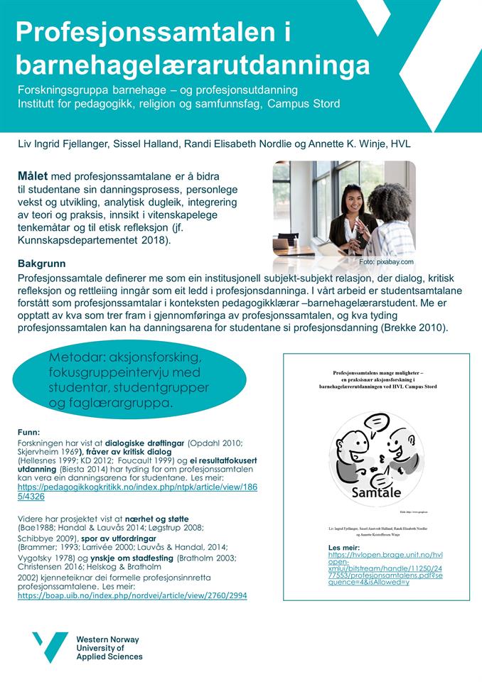 Profesjonssamtalens mange muligheter – en praksisnær aksjonsforskning i barnehagelærerutdanningen ved HVL Campus Stord. Stord: Høgskulen på Vestlandet 2017 31 s.