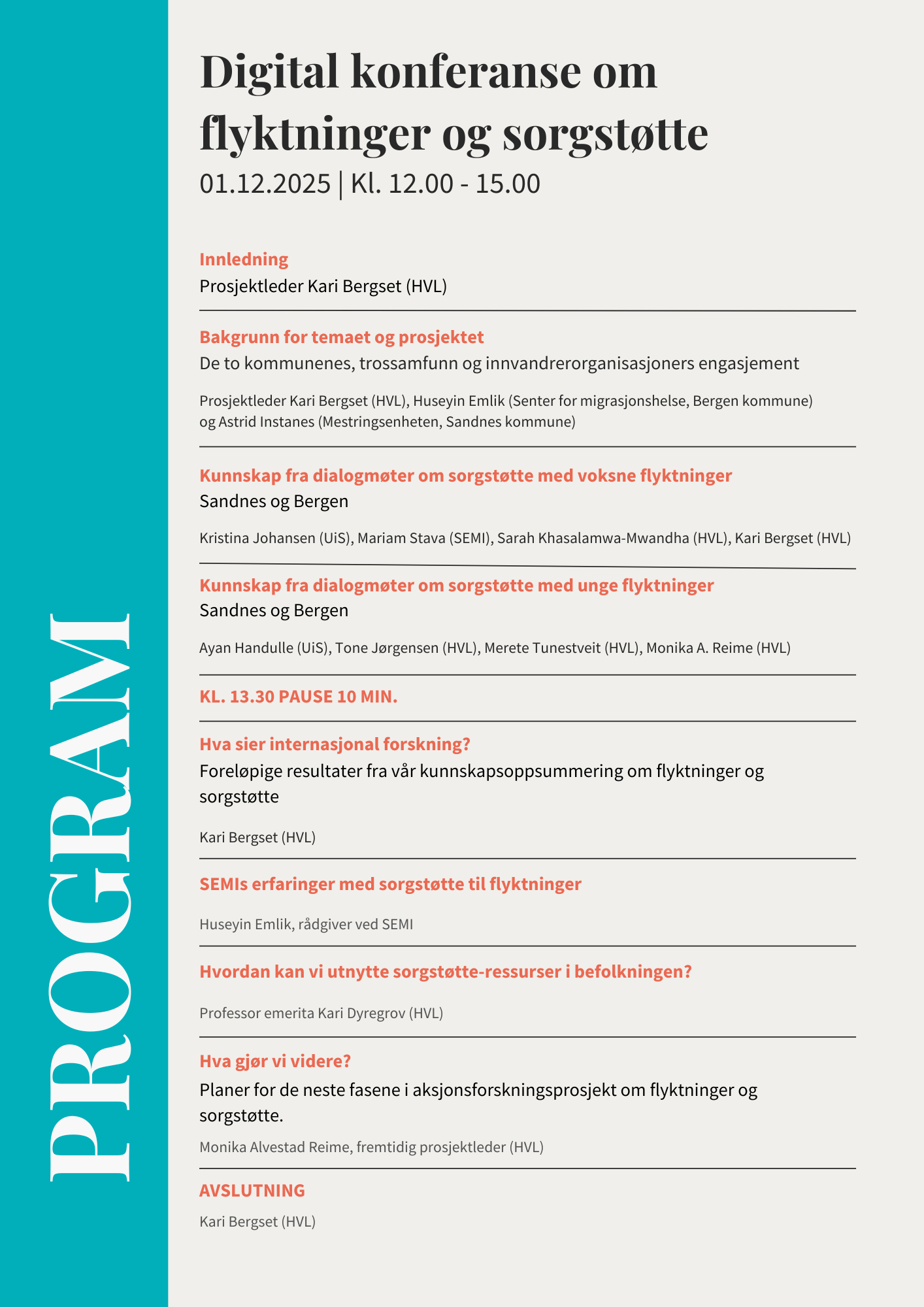 Forskere ved Høgskulen på Vestlandet og Universitetet i Stavanger har gjennom hele dette året samarbeidet med Bergen kommune ved Senter for migrasjonshelse (SEMI) og Sandnes kommune ved Mestringsenheten om et aksjonsforskningsprosjekt om gjelder flyktninger og sorgstøtte. Innvandrerorganisasjoner og flyktningers trossamfunn i de to byene har vært aktive bidragsytere. Neste fase i prosjektet er å utvikle pilottiltak i kommunene.