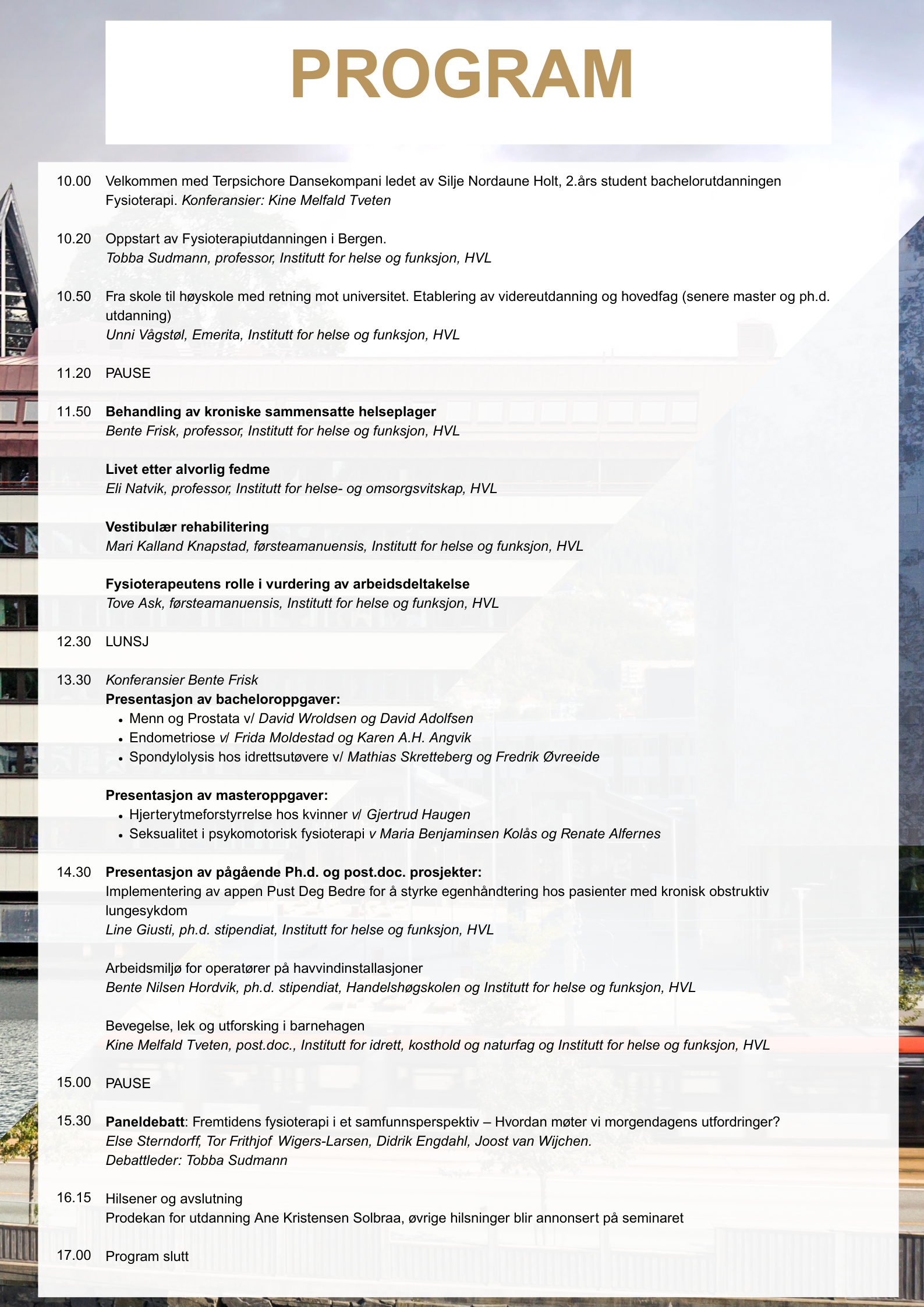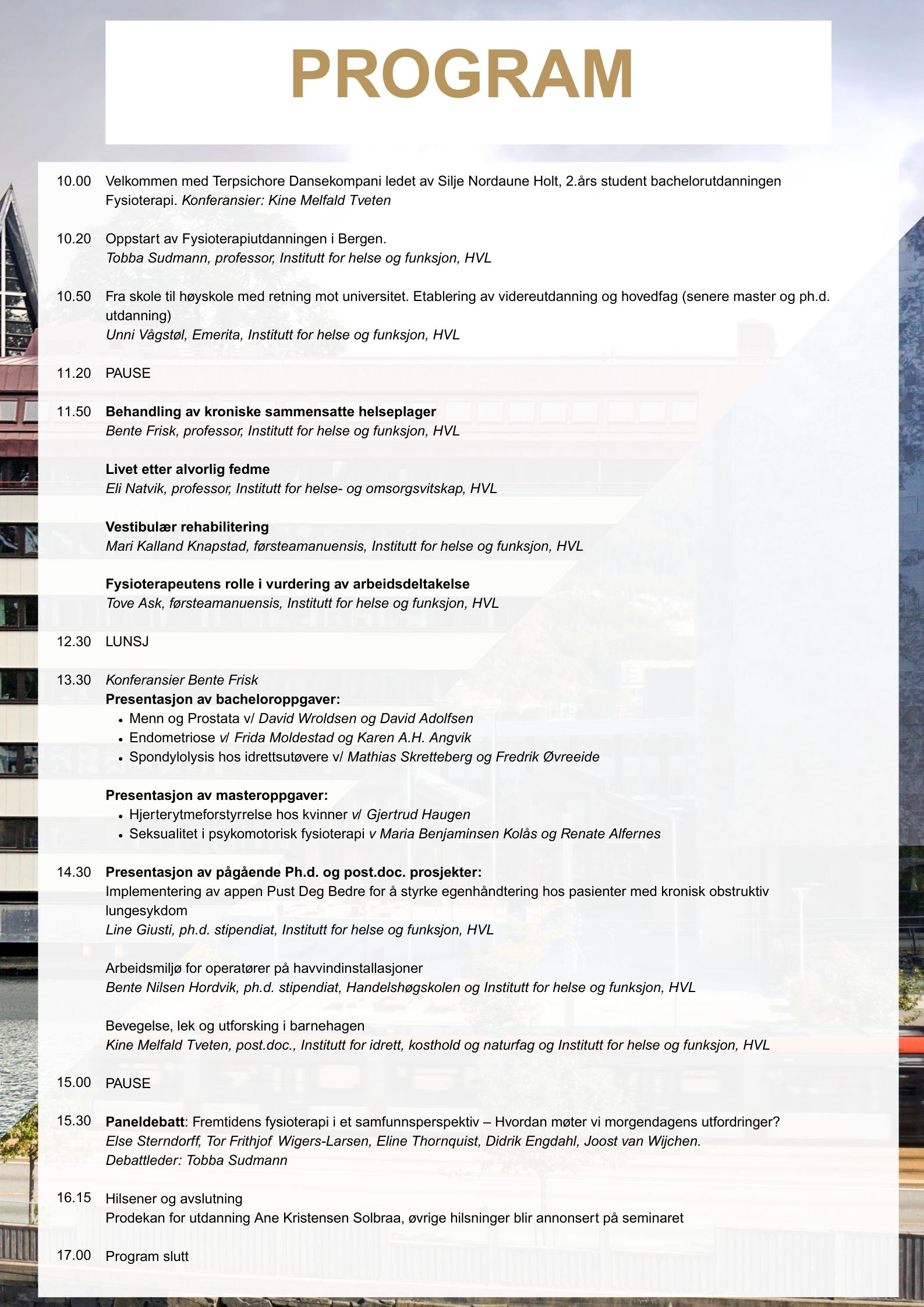 Vi inviterer til feiring av denne viktige milepælen i HVL sine lokaler på Kronstad, i Mimes Brønn. Vi håper du kommer. Alle som har et forhold til fysioterapeututdanningen i Bergen enten som arbeidsgivere, praksisisveiledere, tidligere eller nåværende studenter er hjertelig velkommen.