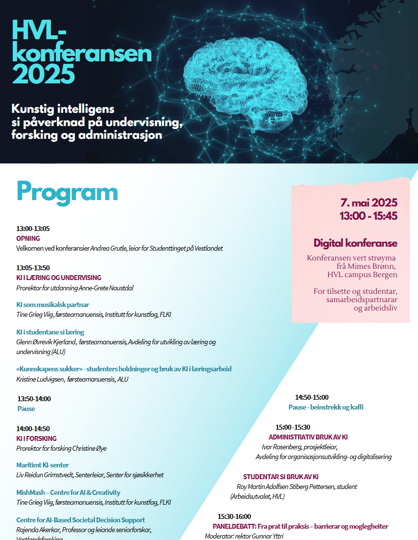 Velkomen til HVL-konferansen onsdag 7. mai 2025. Årets tema: Kunstig intelligens (KI) si påverknad på undervisning, forsking og administrasjon