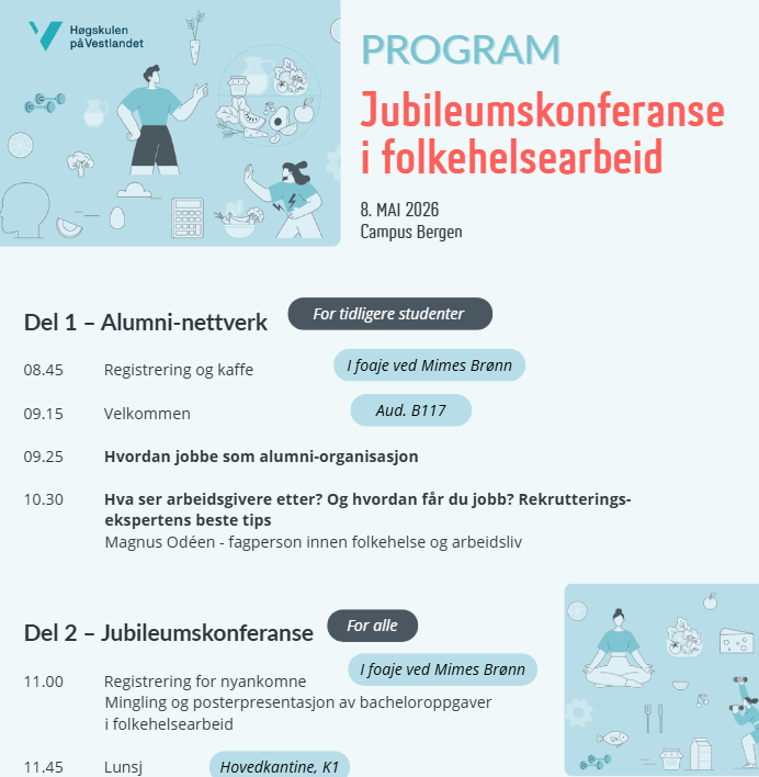 Velkommen til jubileumskonferanse i folkehelsearbeid! 8. mai på HVL campus Bergen feirer vi at det er 20 år siden oppstart av bachelorutdanningen "Bachelor i folkehelsearbeid med vekt på kosthold og fysisk aktivitet".