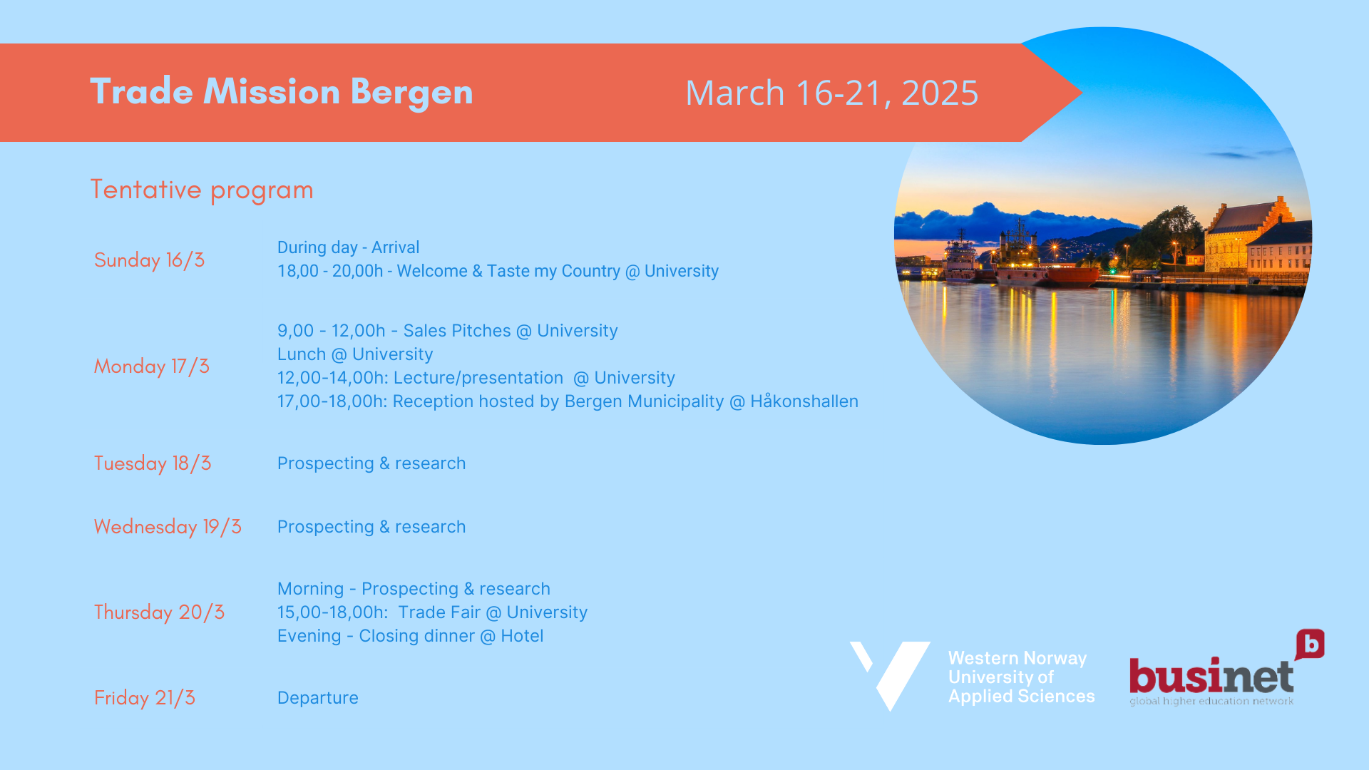 Businet and Western Norway University of Applied Sciences (HVL) are pleased to welcome you to the International Trade Mission in Bergen, Norway, from March 16th to March 21st.
