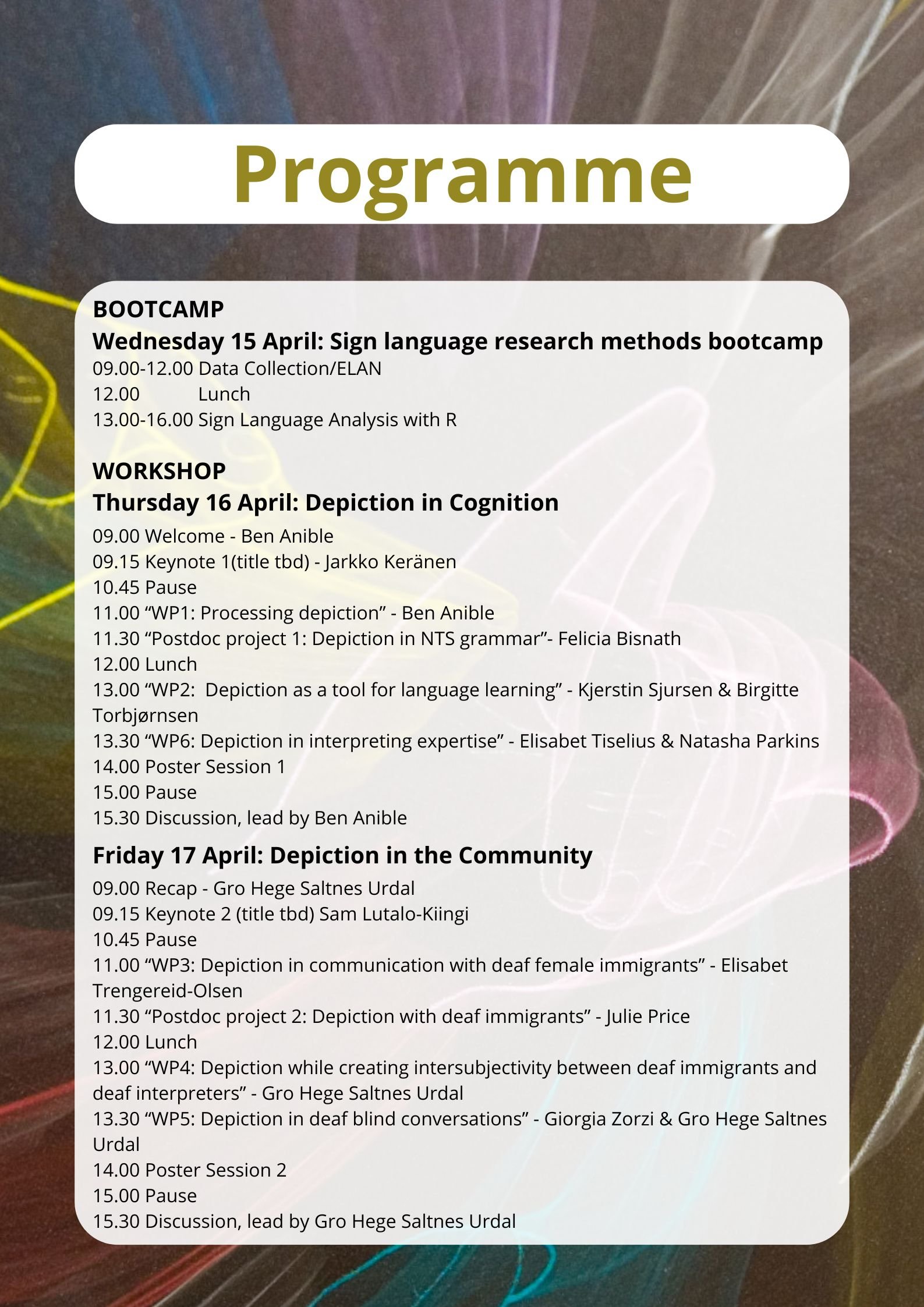 The Research Council of Norway funded project, Depiction as an Engine for Promoting Inclusion, Communication, and Translation (DEPICT), has been investigating the integral role of depiction in Norwegian Sign Language (NTS) since 2021. This workshop aims to delve into the findings of DEPICT and depiction generally, fostering discussions on how depiction supports communication and inclusion within deaf community signed languages. We will also host a one-day methods bootcamp on 15 April covering signed language analysis with R and data collection with ELAN.