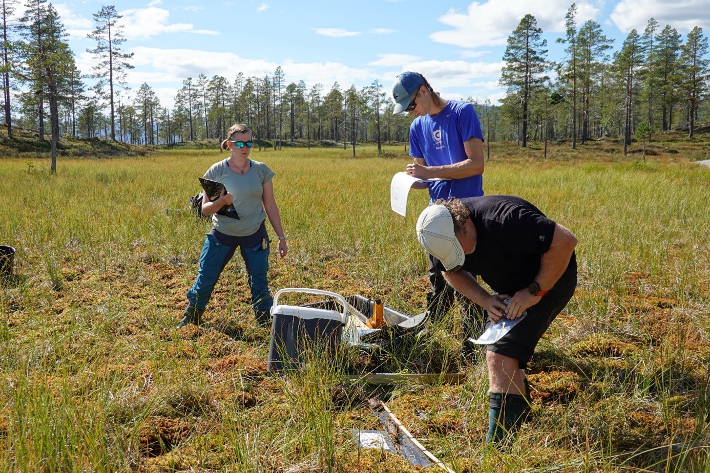 Myrforskarane i sitt rette element – ståande opp til anklane i surklande myrvatn, omgitt av mose og mygg. Foto: Karl-Kristian Muggerud
