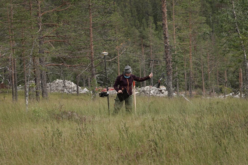Forskarane bruker både supernøyaktig GPS, torvkuttar, torvspyd og russarbor for å utforske myra og hente ut torvprøvar. Foto: Ingrid Knutsdotter Koren.