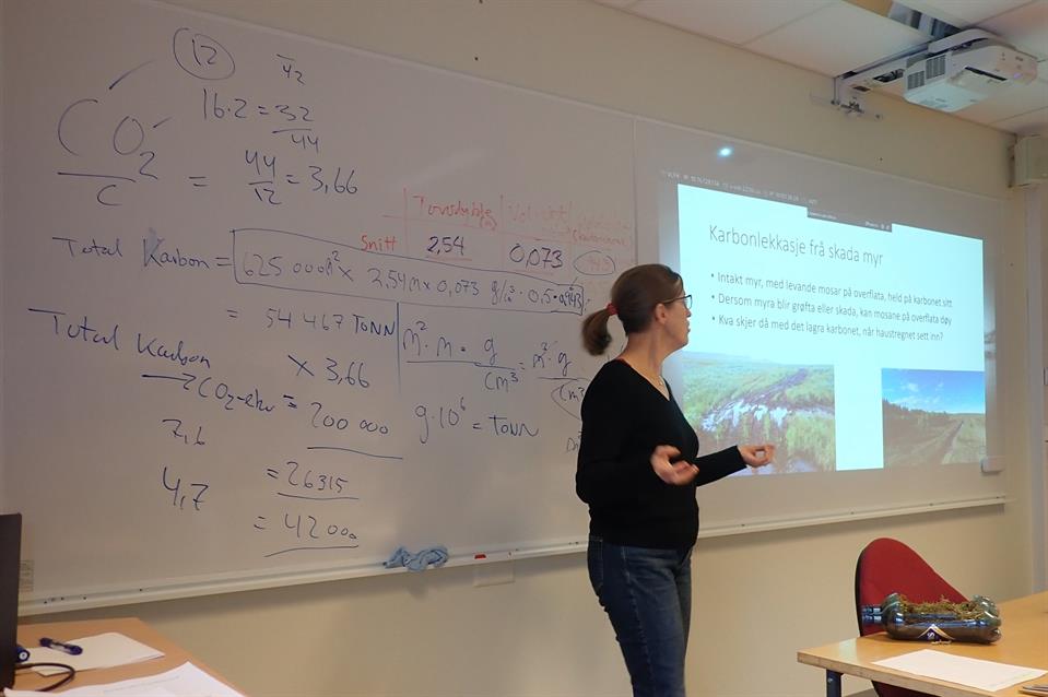 Vi rekna saman ut det totale karbontapet frå utbygginga av den 625 dekar store høgmyra Bjørkemåsan i Nannestad kommune, som bachelor- og masterstudentar frå HVL har kartlagt tidlegare. De fleste elevane var einige i at dette inngrepet, som førte til eit karbontap tilsvarande det årlege utsleppet til 26 500 nordmenn, var lite smart.