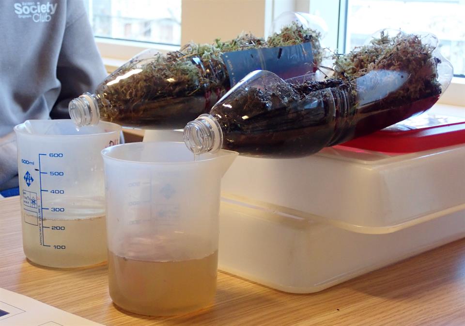 Elevane gjorde i tillegg eit praktisk eksperiment for å samanlikne skada myr (t.d. myr som har blitt køyrt opp av barmarkskøyring) og intakt myr (med sunn og levande torvmose på overflata). Held dei like godt på vatn når det regnar som verst, og korleis påverkar myra sin tilstand lekkasje av karbon ut i drikkevatn? Måling og samanlikning viste at den intakte myra jamt over fungerer betre enn den skada.