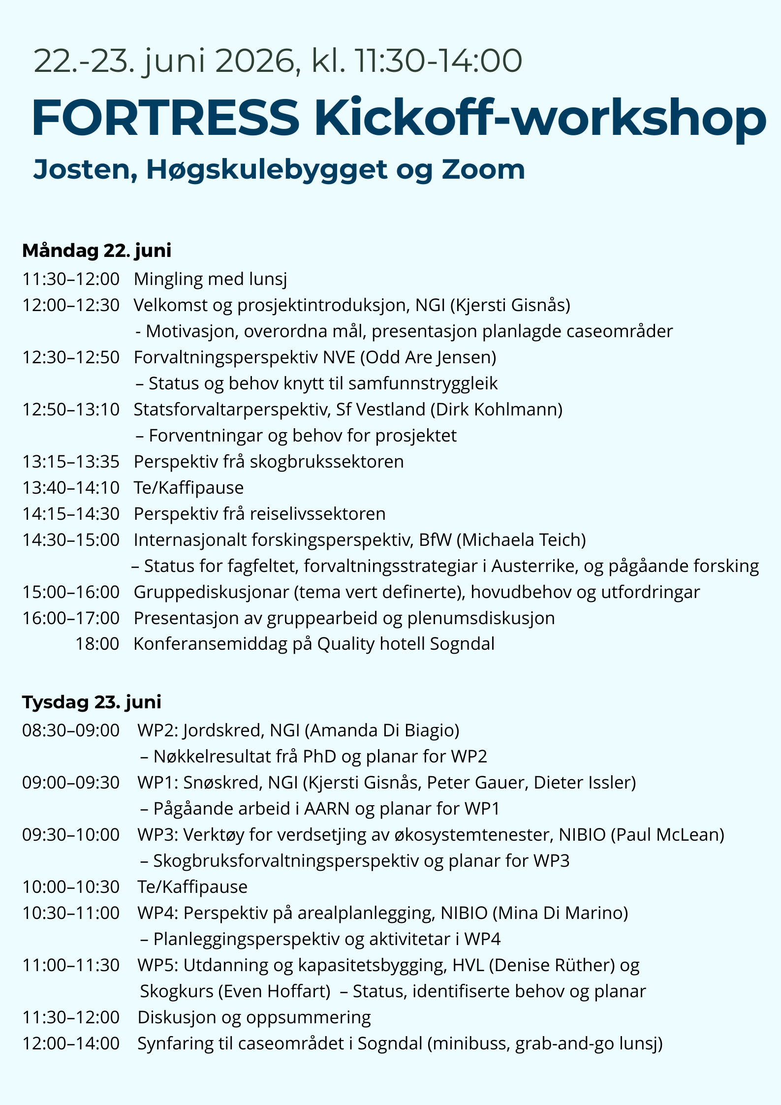 Kickoff-workshopen startar med mingling og lunsj før deltakarane får ei brei introduksjon til temaet frå ulike perspektiv, inkludert prosjektleiing, forvaltning, skognæring, turistnæring og forsking. Dagen helt fram med gruppearbeid og plenumsdiskusjonar, før han blir avrunda med konferansemiddag på kvelden. Neste dag blir planar for arbeidspakkene om snøskred, jordskred, skogskjøtsel, arealplan og utdanning presentert. Programmet blir avslutta med ein diskusjon og oppsummering, etterfølgt av ei felles befaring til feltovervåkingslokaliteten i Sogndal.
