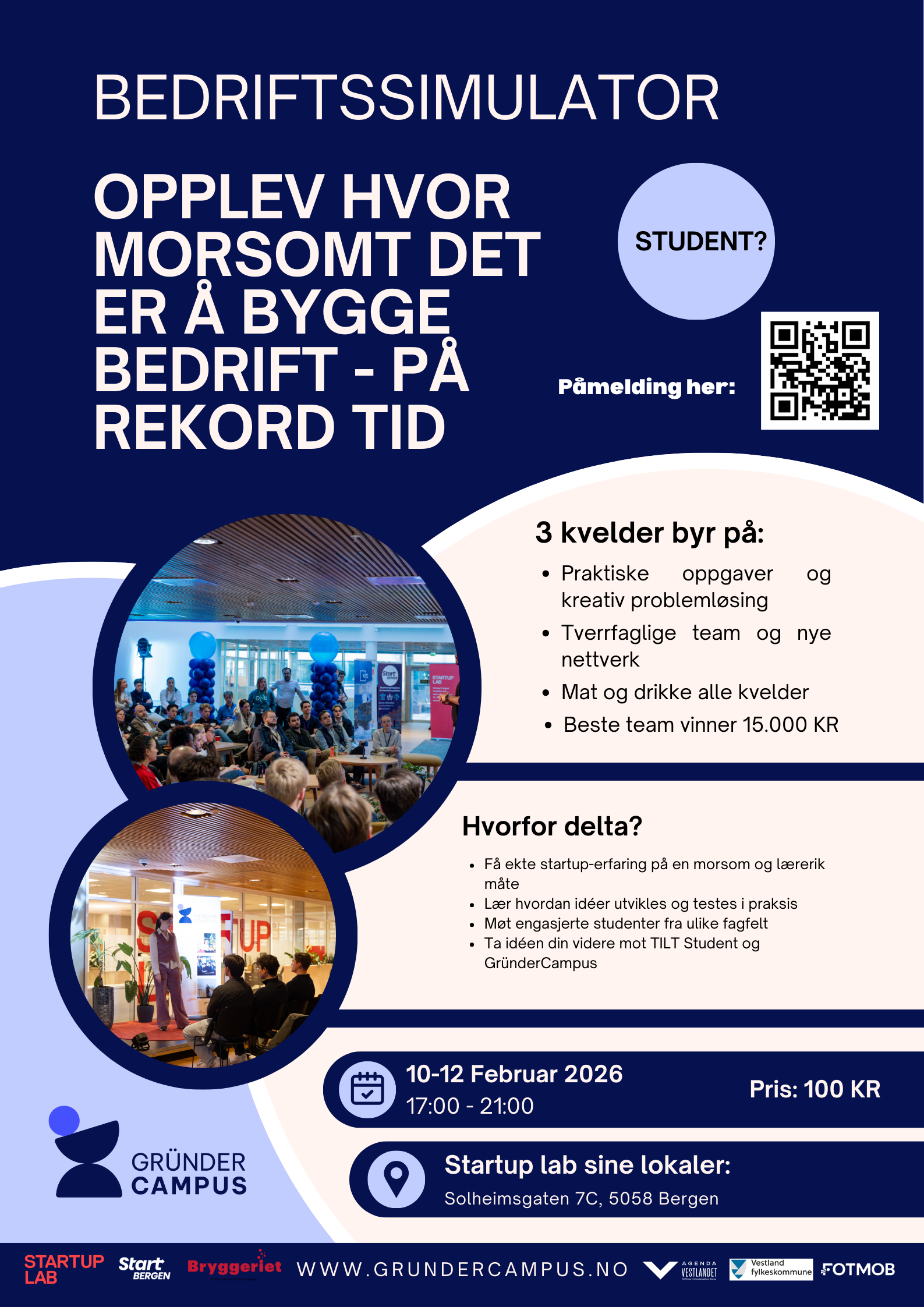 Her møter du studenter fra alle studiesteder i Bergen, jobber i team og får kjenne på stemningen i et ekte gründer- og studentmiljø. ✨ I tillegg får du pitche foran en jury bestående av gründere fra miljøet i Bergen. Vinner-teamet stikker av med premie på 15.000 kroner. Alle som deltar og ender opp med en idé kan videreføre idéen sin mot blant annet TILT Student og andre student ordninger i Bergen.