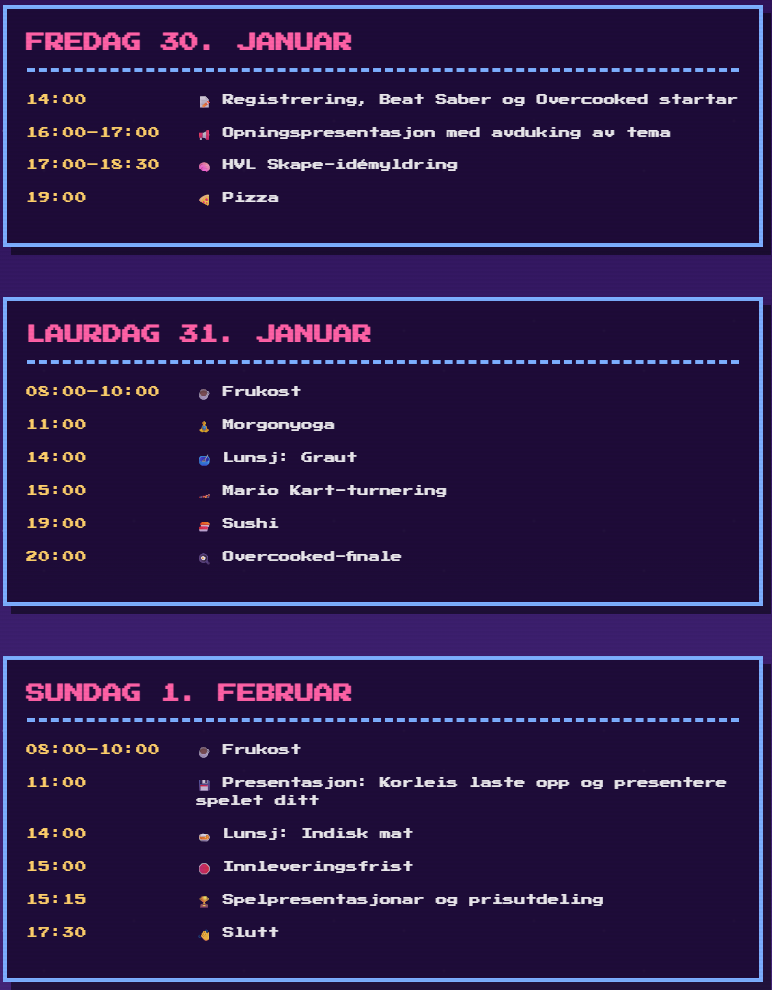 Har du aldri laga eit spel før? Ikkje noko problem! Vi held workshops med tips og triks, og du kan møte andre spelinteresserte heile helga. Velkomen!