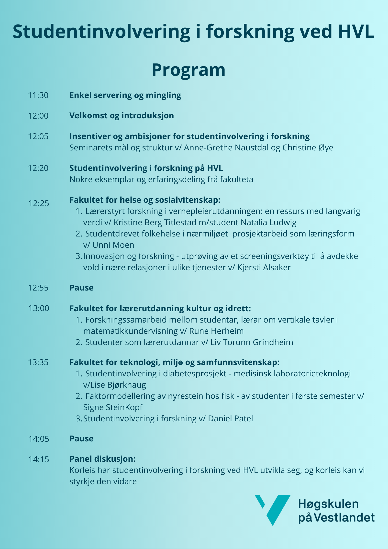 Med dette seminaret ønsker vi tydeliggjøre hvordan studenter kan være en aktiv ressurs i forskningsprosesser, og hvordan godt samarbeid mellom studenter og ansatte kan bidra til ny kunnskap og innovasjon. Vi ønsker å bygge en kultur ved HVL der forskningssamarbeid starter tidlig i studieløpet, og der studenter ser seg selv som sentrale deltakere i kunnskapsutviklingen.