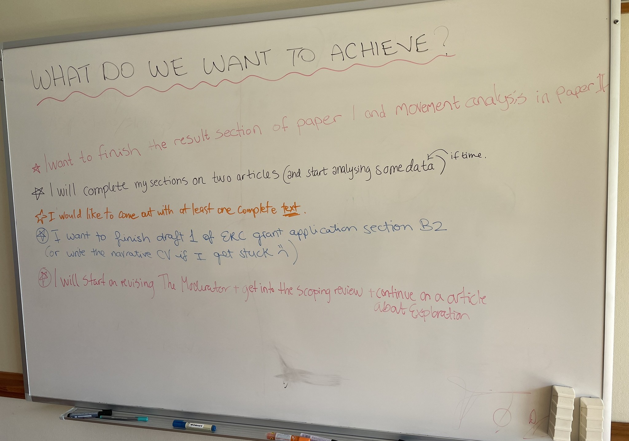 We also wrote our goals for the writing retreat on a whiteboard; we tried to make these realistic aims. At the end of each day, we spoke about what we had achieved and how close we were getting to our overall stated goal – most of us managed to finish at least one of the writing projects we had planned for ourselves, a great feeling!