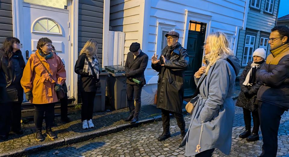 Nettverks- og relasjonsbygging er en viktig del av forskerskolen, og på slutten av dagen gjennomførte vi en byvandring med historiske perspektiver fra den spede start for barnehageoppstarten i Bergen.