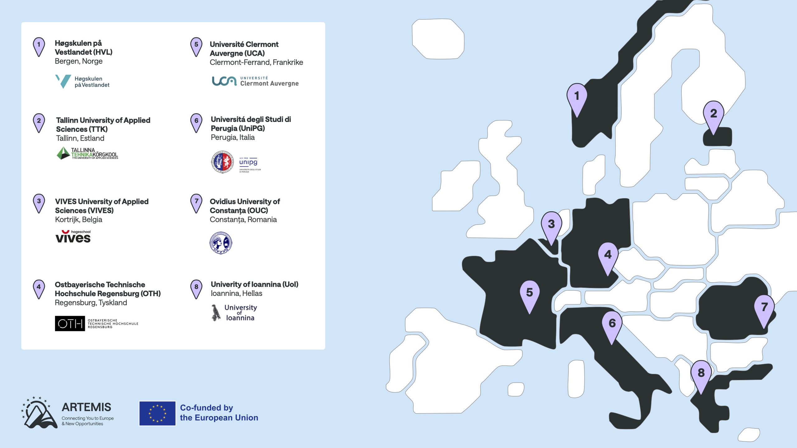 Tre av partnerne tilbyr doktorgradsutdanning (UCA, UOI og OUC), en partner tilbyr bachelor og masterutdanning (OTH) og to tilbyr bachelorutdanning (VIVES og TTK). Alle partnerne i prosjektet driver profesjonsrettet utdanning og forskning. Tre av partnerne er større universitet med en bredde som går utover det profesjonsrettede (UCA, OUC og UOI), en partner er en teknisk høyskole (TTK) og to partnere er rene profesjonshøgskoler/Universities of Applied Sciences (VIVES og OTH).