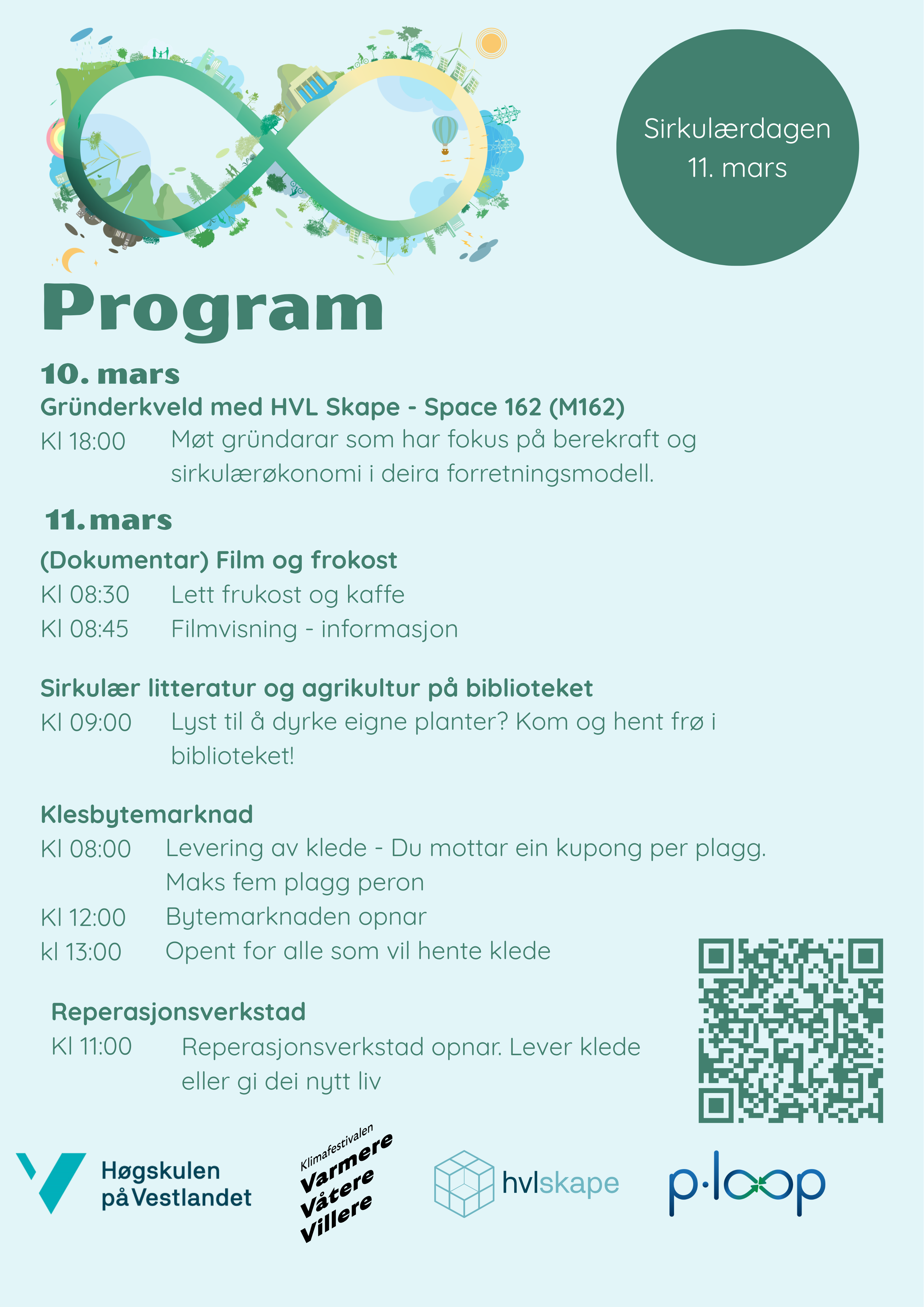 Tysdag 10. mars inviterer HVL Skape til ein inspirerande kveld der du kan møte gründarar som har berekraft og sirkulærøkonomi som ein sentral del av deira forretningsmodell. Det vert god stemning, matservering og inspirerande innlegg. Har du ein god idé er det også moglegheit for å vinne ein goodiebag fra HVL Skape. Vi skal vere på HVLS hotteste lokasjon: Space 162 – som er HVLs nyetablerte makerspace i K2.