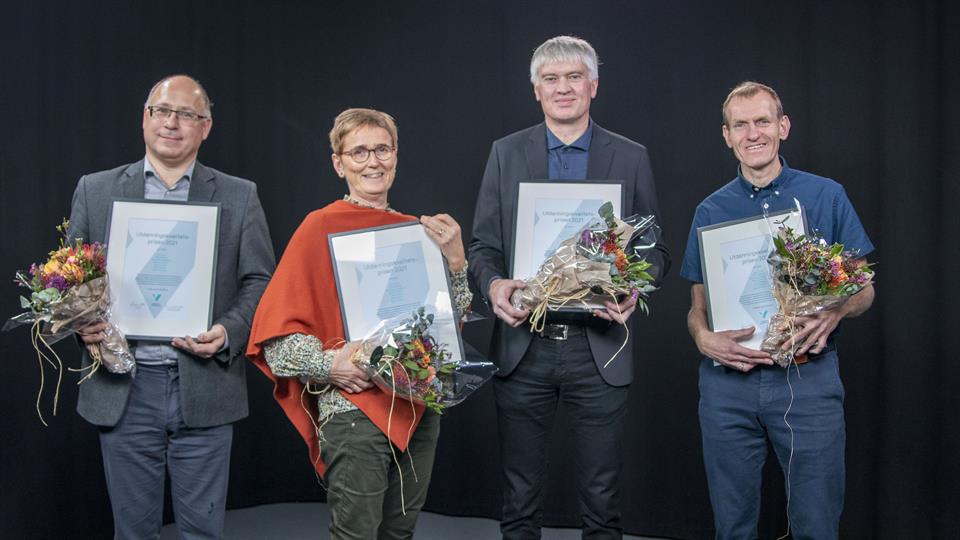 Marcin Fojcik, Toril Midtbø, Joar Sande, og Lars Kyte tok imot prisen på vegne av lærargruppa frå campus Førde. Også med i gruppa er Olav Sande, Bjarte Pollen og Pål A. Hegland. Nyhendesak HVL 2021.